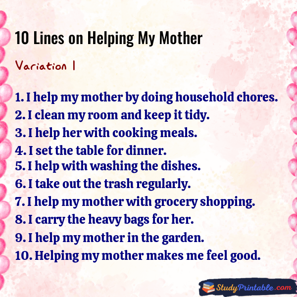 Helping my mother is a great way to show love. It makes her happy and reduces her burden. Here are different ways I help my mother.
