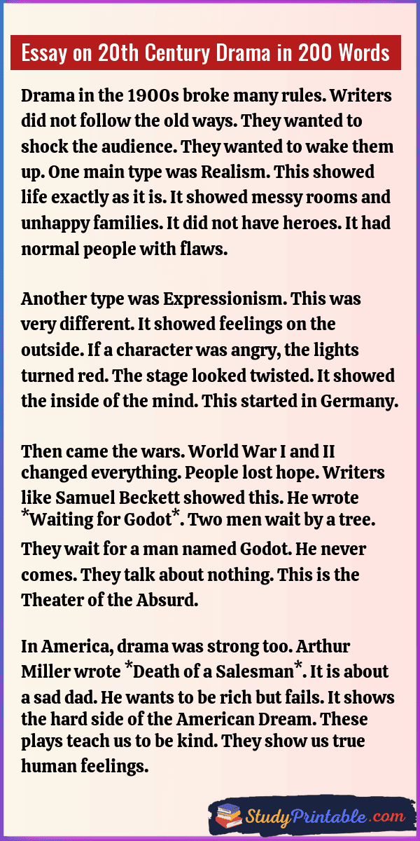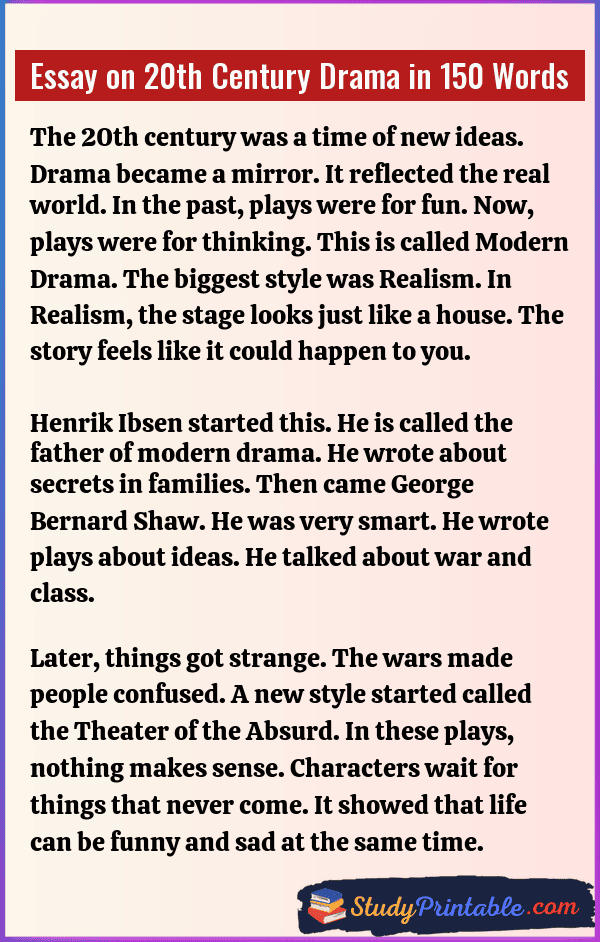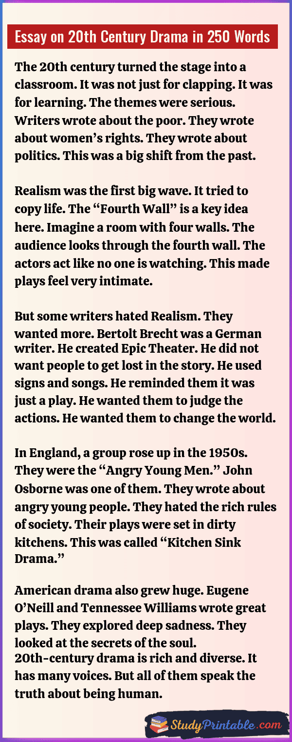 Drama changed a lot in the last century. Before this time, plays were about kings. They were about magic and old myths. But the 20th century brought a big change. Writers looked at real life. They looked at normal homes. They showed the pain of war. They showed how people really talk. It was a time of truth. This art form helps us understand the modern world. These essays are written for students in classes 1 to 12.