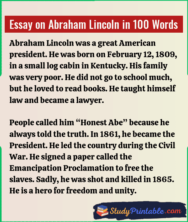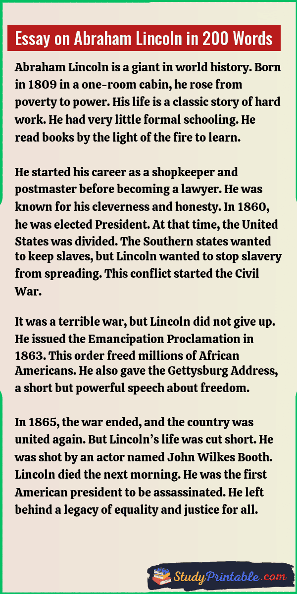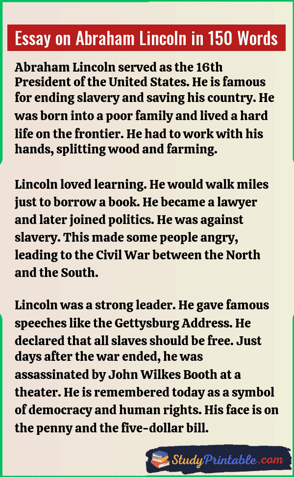 Abraham Lincoln is one of the most famous leaders in history. He was the 16th President of the United States. He is remembered for his tall hat, his honest nature, and his brave leadership during a very hard time called the Civil War. He worked very hard to stop slavery and keep his country together. His life story shows that even a poor boy born in a small log cabin can grow up to change the world. The following essays are written for students from Class 1 to Class 12.