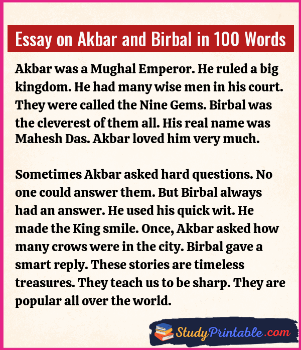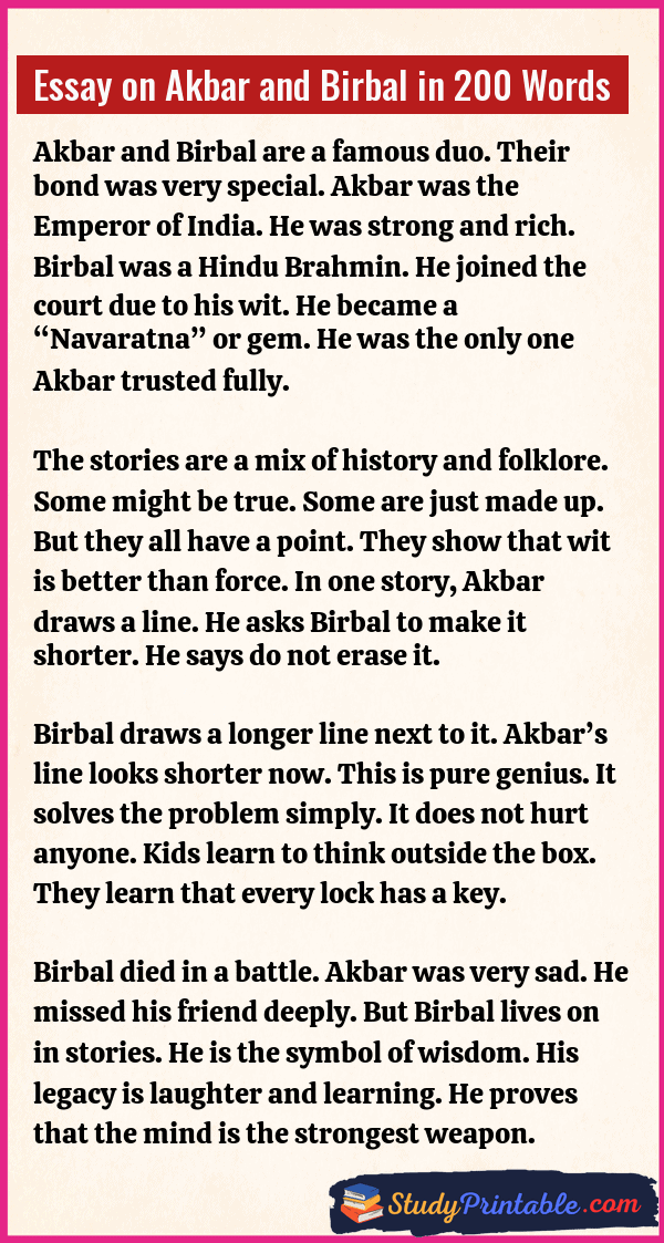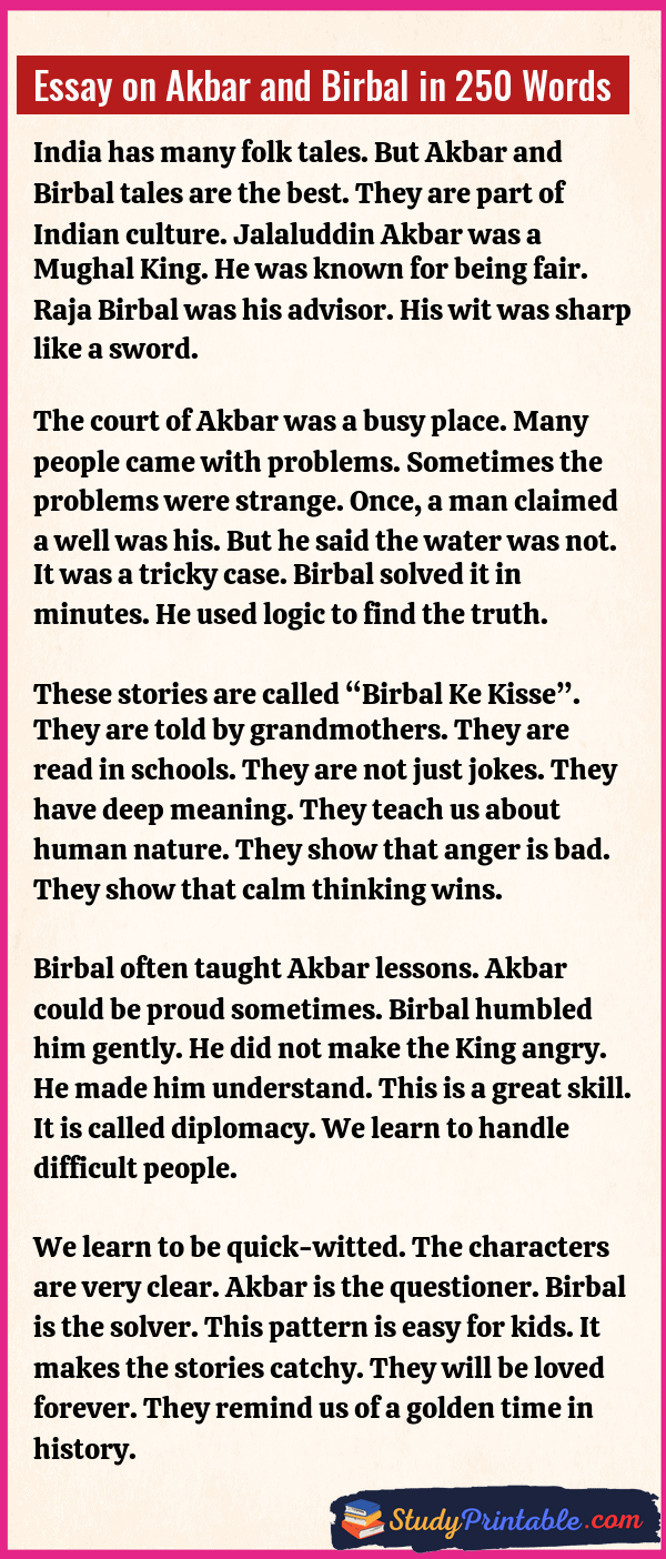 The stories of Akbar and Birbal are very famous. They come from India. Akbar was a great King. Birbal was his smart friend. These tales are full of fun. They make us laugh and think. They teach us to use our brains. They show that wisdom is a great power. Kids love these stories. These essays are written for students in classes 1 to 12.