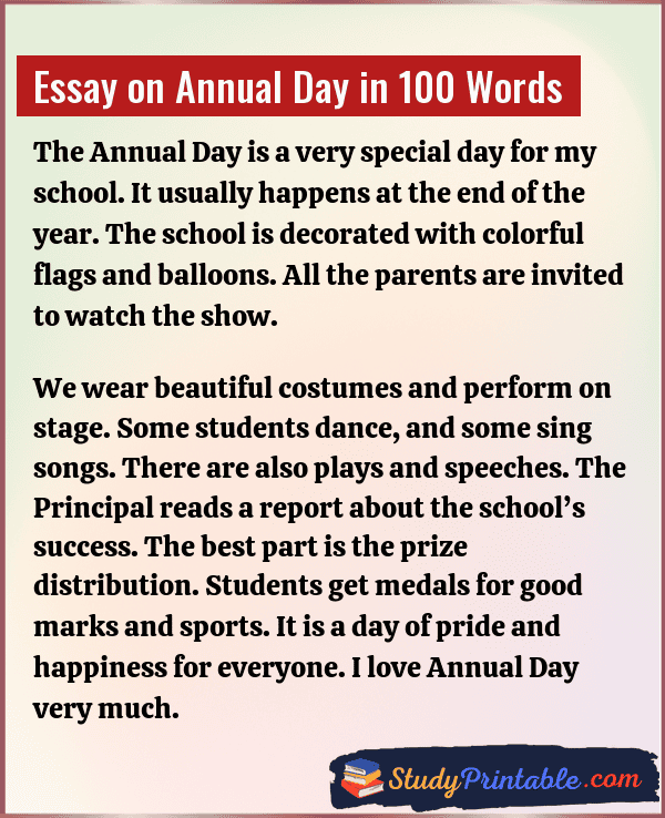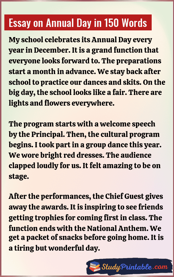 The Annual Day is a very special day for my school. It usually happens at the end of the year. The school is decorated with colorful flags and balloons. All the parents are invited to watch the show.
