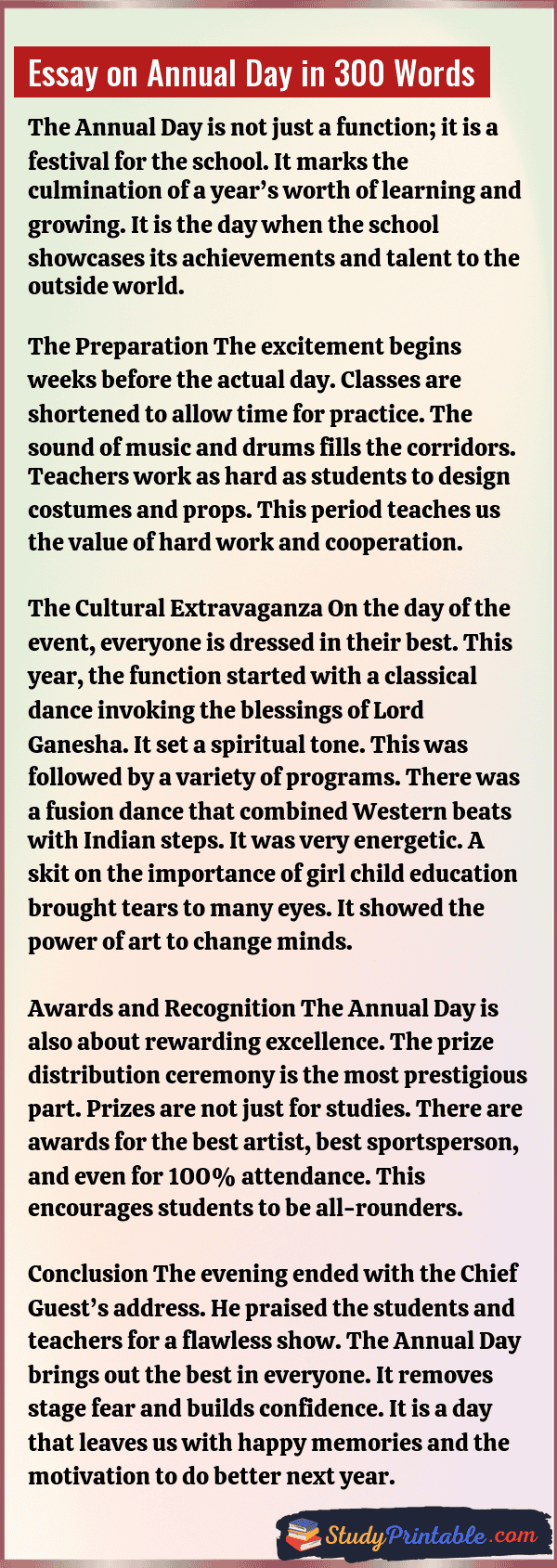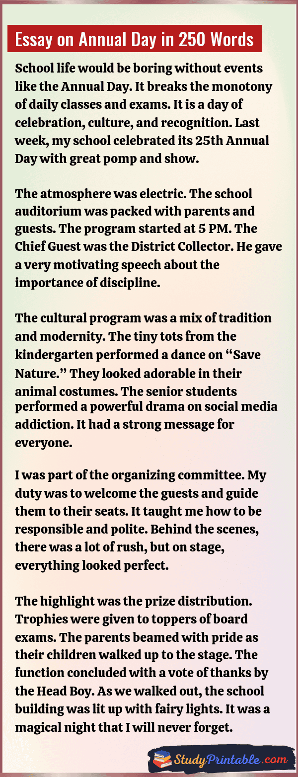 The Annual Day is the most awaited event in every school. It is a day full of joy, music, and dance. Students practice for weeks to put on a great show for their parents and teachers. It is not just about fun; it is a day to celebrate talent and hard work. Prizes are given to those who did well in studies and sports. It brings the whole school family together to create happy memories. The following essays are written for students from Class 1 to Class 12.
