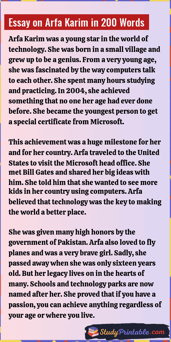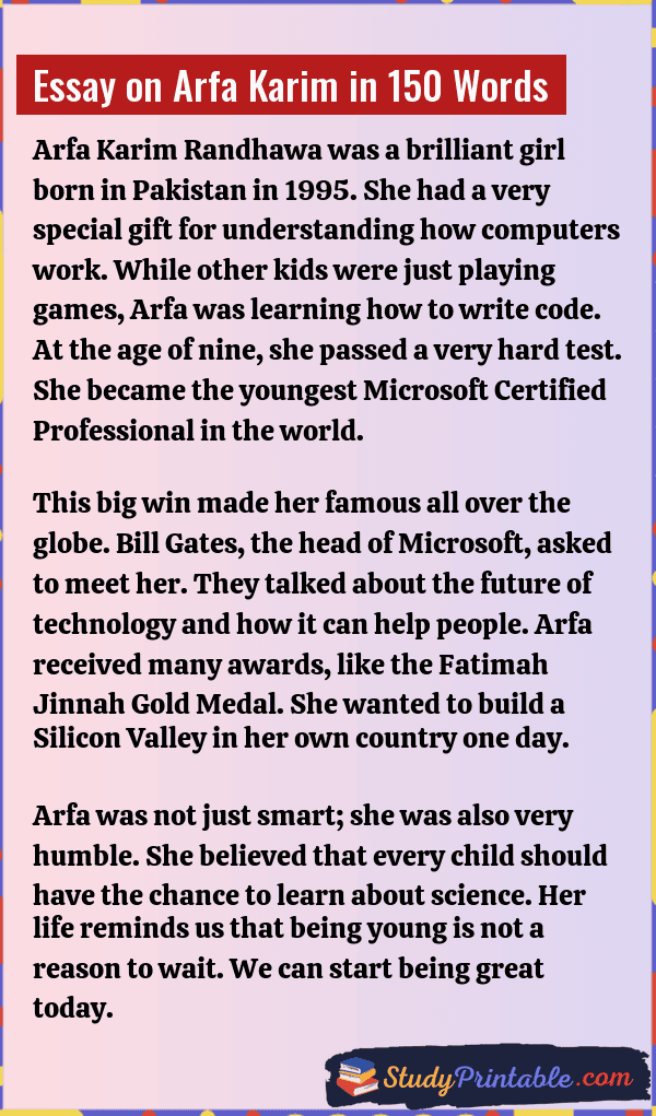 Arfa Karim was a very bright girl who showed the world that age does not limit what a person can do. She became a hero for many young kids by becoming a master of computers when she was only nine years old. Her story tells us that with hard work and a love for learning, anyone can reach the stars. She made her country proud and inspired many girls to study science and technology. By winning big prizes, she proved that even small hands can change the big world of computers. Her life is a shining light for students everywhere. The following essays are written for students from Class 1 to Class 12.