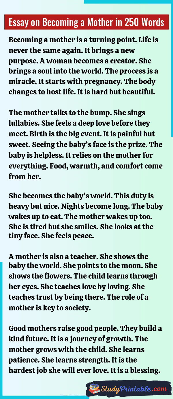 Becoming a mother is a very special time. It changes a woman’s life forever. A new life begins. It is a time of great joy. It is also a time of big duty. A mother shapes the future. She teaches love and kindness. Her impact is huge. The bond is very deep. These essays are written for students in classes 1 to 12.