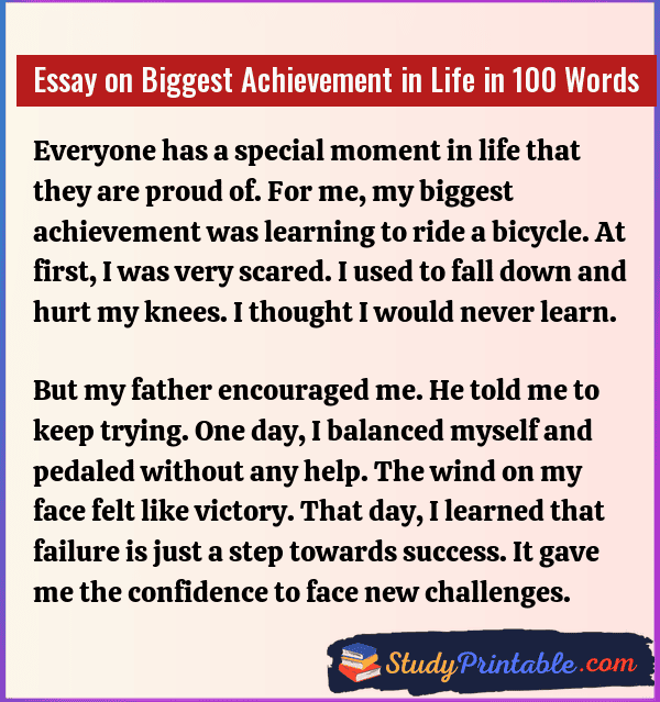 Achievement is not just about winning a gold medal or standing first in class. It is about setting a goal and working hard to reach it. The biggest achievement in life is often overcoming a fear or learning something difficult. It gives us happiness and self-belief. It teaches us that nothing is impossible if we try. These moments of success become our best memories. The following essays are written for students from Class 1 to Class 12.
