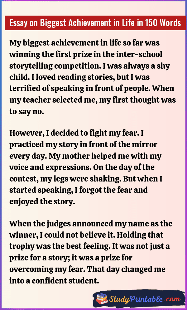 My biggest achievement in life so far was winning the first prize in the inter-school storytelling competition. I was always a shy child. I loved reading stories, but I was terrified of speaking in front of people. When my teacher selected me, my first thought was to say no.
