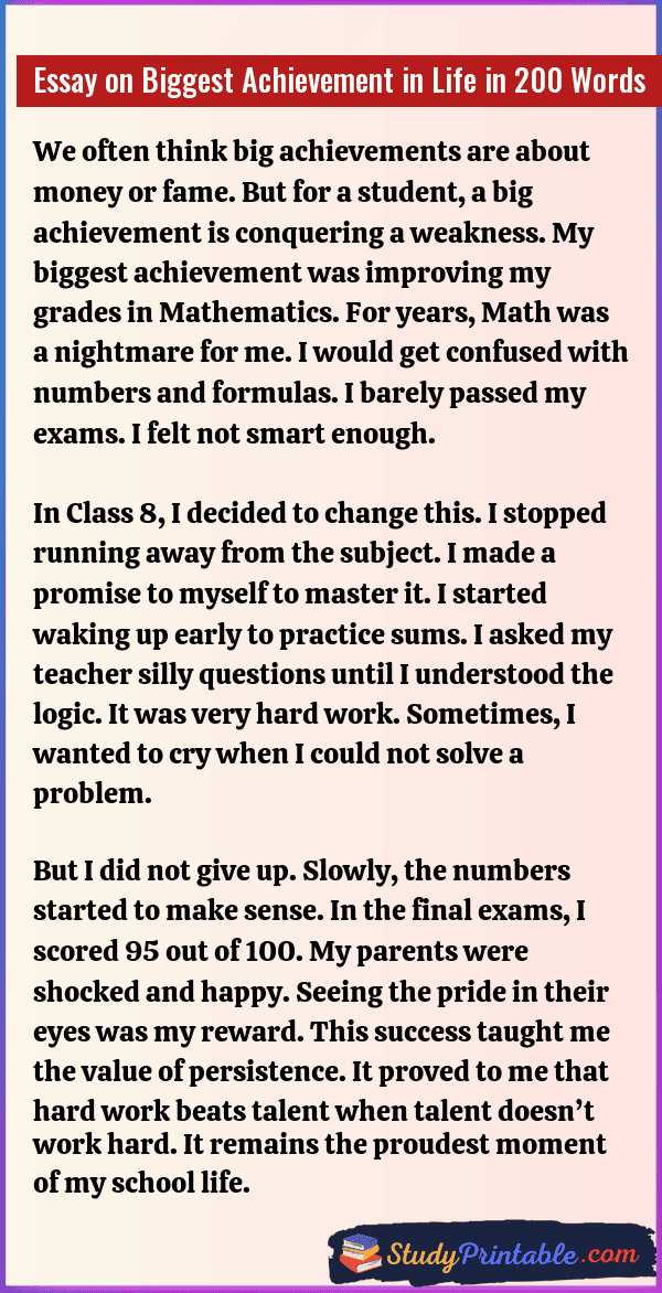 But I did not give up. Slowly, the numbers started to make sense. In the final exams, I scored 95 out of 100. My parents were shocked and happy. Seeing the pride in their eyes was my reward. This success taught me the value of persistence. It proved to me that hard work beats talent when talent doesn’t work hard. It remains the proudest moment of my school life.