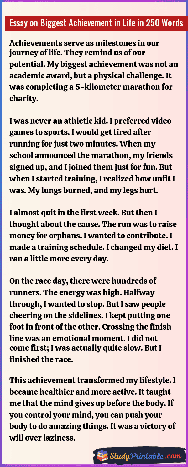 Achievements serve as milestones in our journey of life. They remind us of our potential. My biggest achievement was not an academic award, but a physical challenge. It was completing a 5-kilometer marathon for charity.