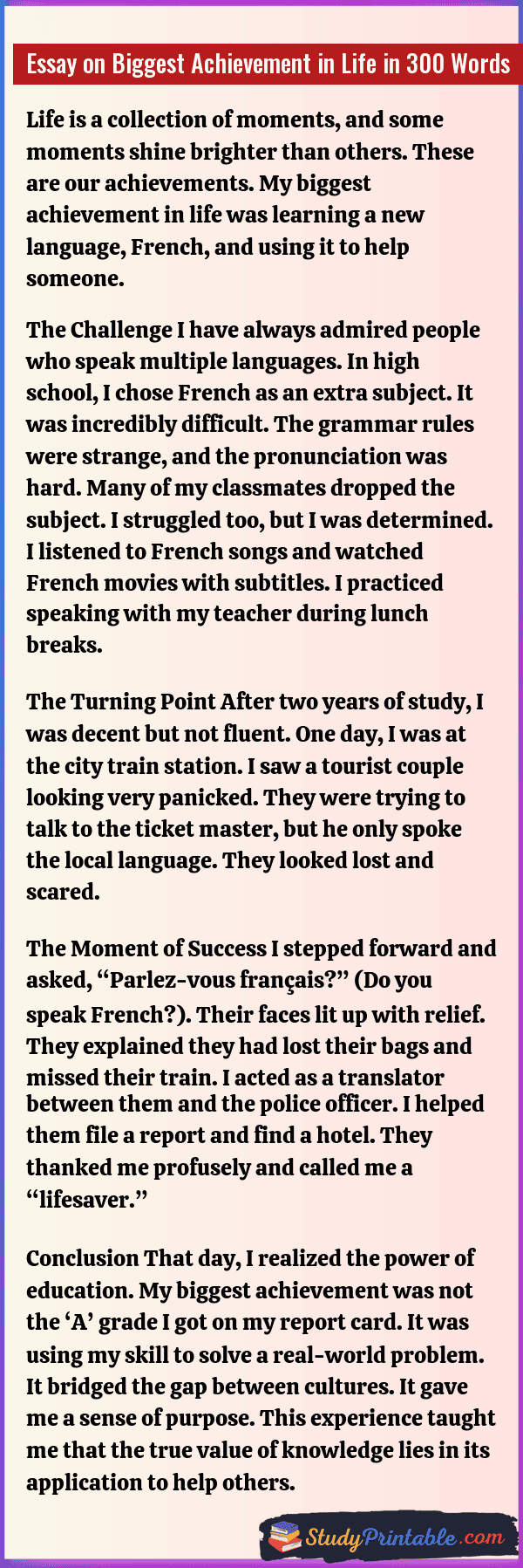 That day, I realized the power of education. My biggest achievement was not the ‘A’ grade I got on my report card. It was using my skill to solve a real-world problem. It bridged the gap between cultures. It gave me a sense of purpose. This experience taught me that the true value of knowledge lies in its application to help others.