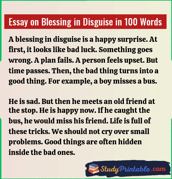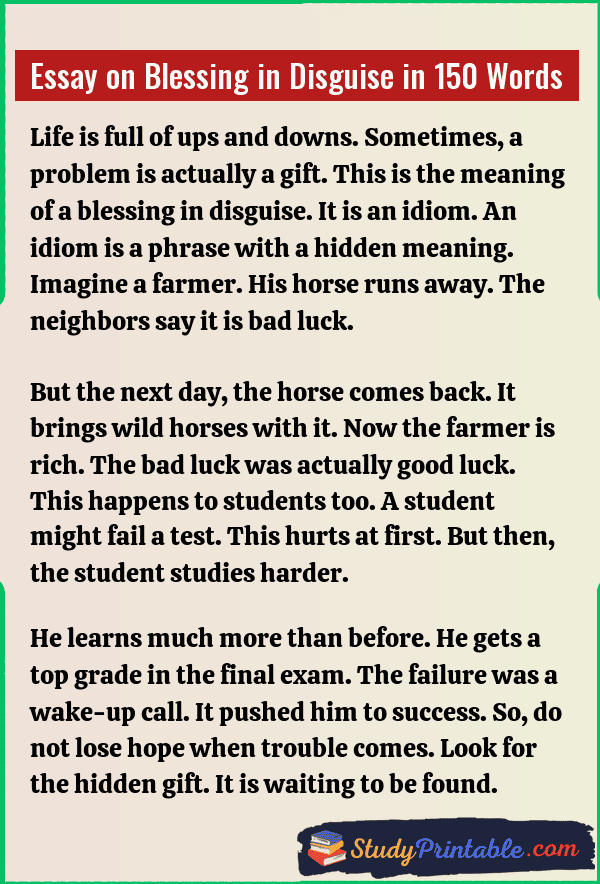 Sometimes bad things happen. People feel sad or angry. But later, good things come from it. This is called a blessing in disguise. It teaches us to be patient. It shows that life has a special plan. A lost toy might lead to a better game. A rainy day might bring beautiful flowers. We must trust the process. These essays are written for students in classes 1 to 12.