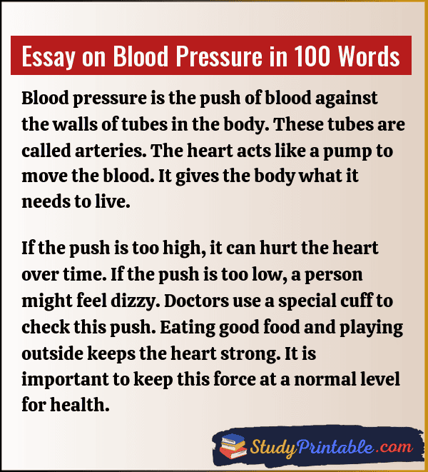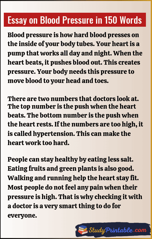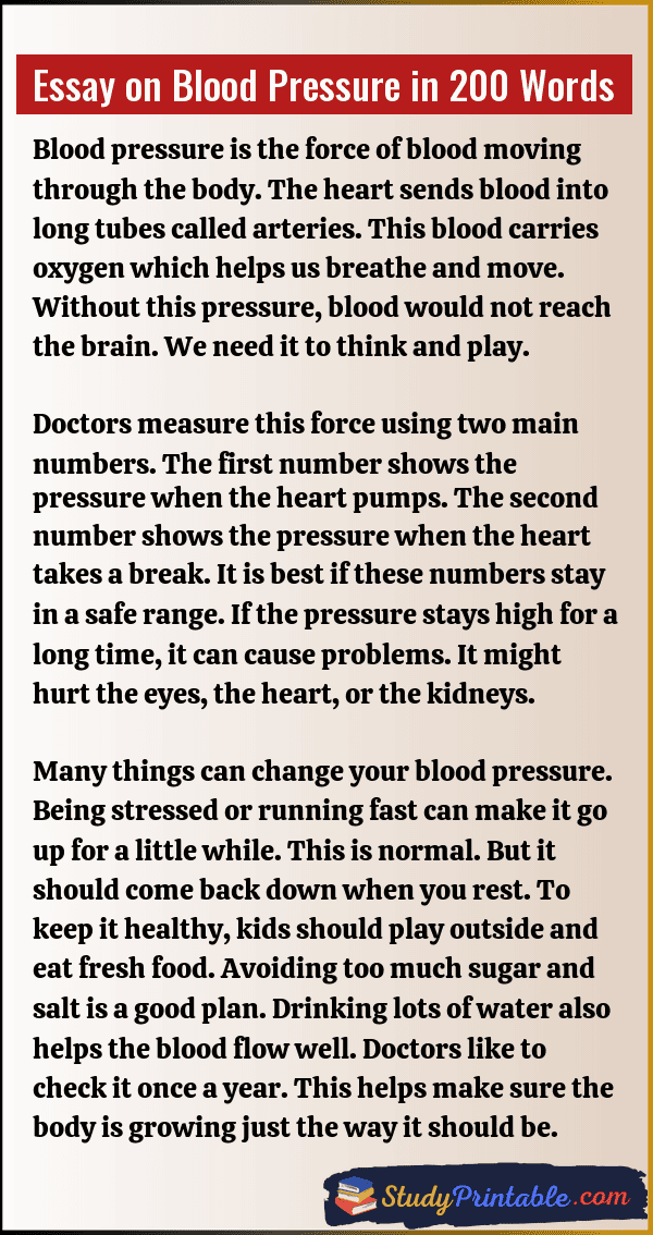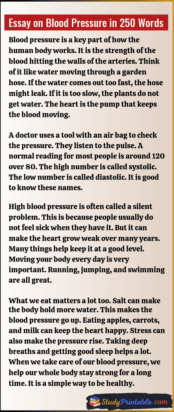 Blood pressure is a very big part of how the body stays strong and healthy. It is the force of the blood as it moves through the heart and veins. This force helps carry food and air to every part of the skin, brain, and toes. Without this push, the body could not work well or grow. Keeping it at a good level helps people run, play, and feel great every day. It is a vital sign that doctors check to make sure the heart is doing its job. Learning about it helps kids and adults stay safe. The following essays are written for students from Class 1 to Class 12.