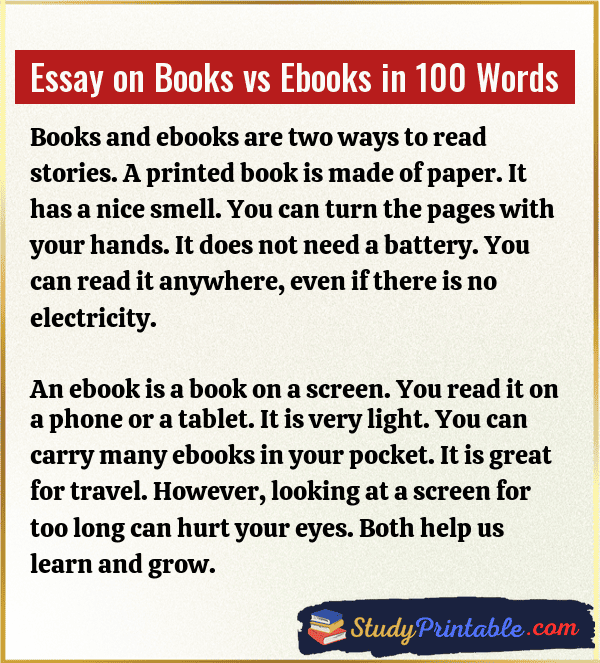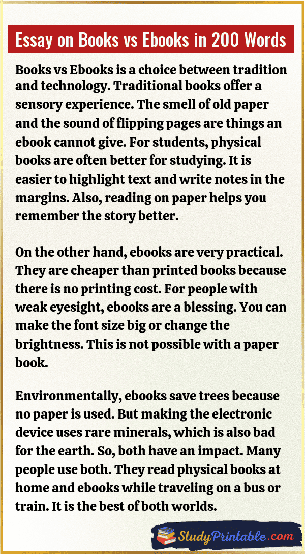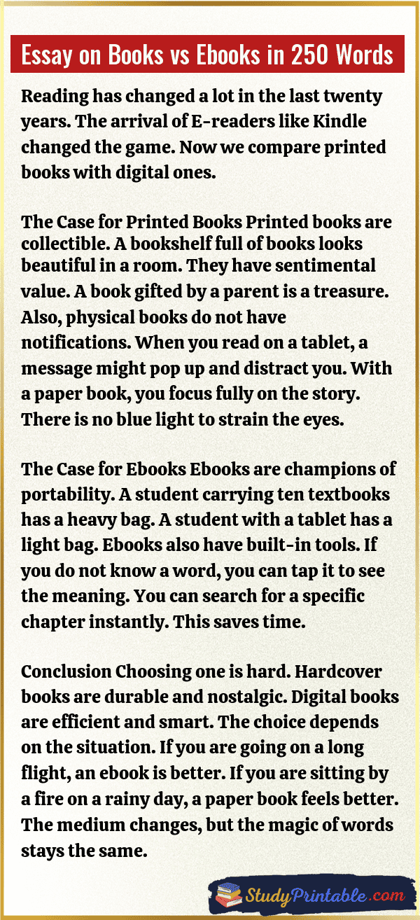 Reading is a great habit, no matter how you do it. But today, readers have two big choices: printed books or ebooks. Printed books are the ones made of paper that we can hold and smell. Ebooks are digital files we read on screens like tablets or phones. Both have good points and bad points. Some people love the feel of paper, while others love carrying thousands of books in one small device. Choosing between them depends on what you like best. The following essays are written for students from Class 1 to Class 12.