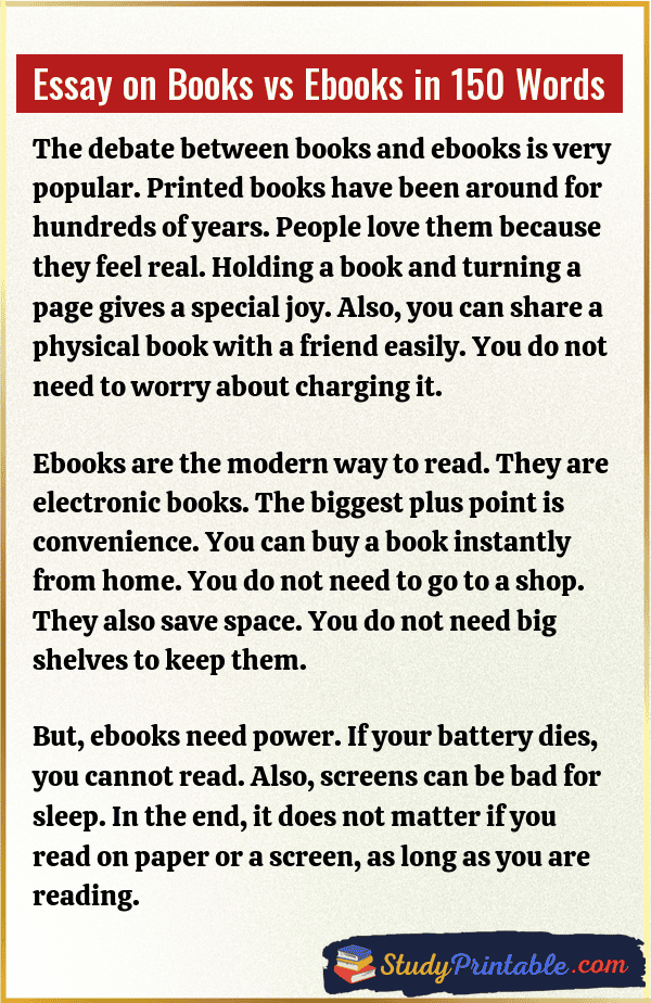 The debate between books and ebooks is very popular. Printed books have been around for hundreds of years. People love them because they feel real. Holding a book and turning a page gives a special joy. Also, you can share a physical book with a friend easily. You do not need to worry about charging it.