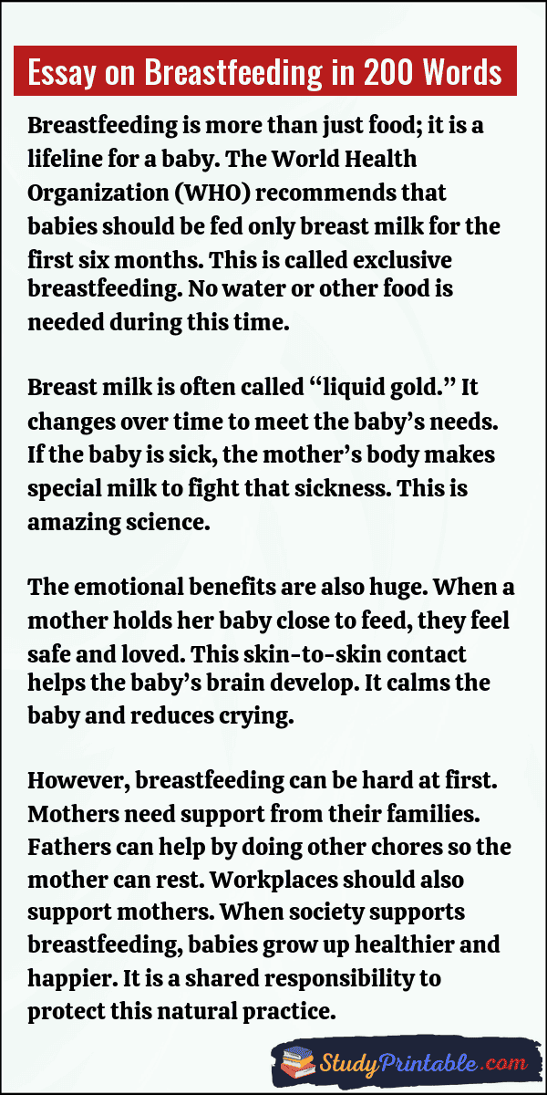 Breastfeeding is the natural way of feeding a baby with milk produced by the mother. It is often called the “golden start” of life because it provides the perfect food for a newborn. Breast milk is full of nutrients and special protectors that keep the baby safe from illnesses. Doctors all over the world recommend it as the best choice for a baby’s health. It also creates a strong bond of love between the mother and the child. The following essays are written for students from Class 1 to Class 12.