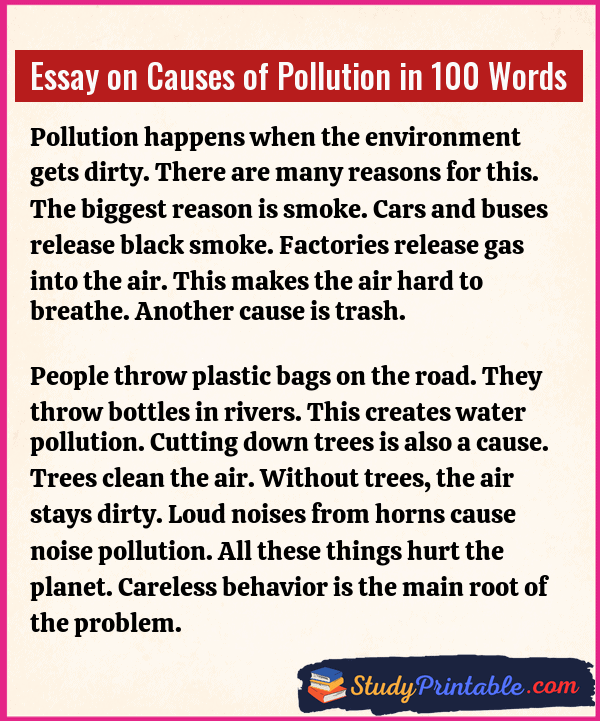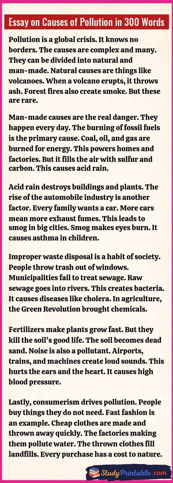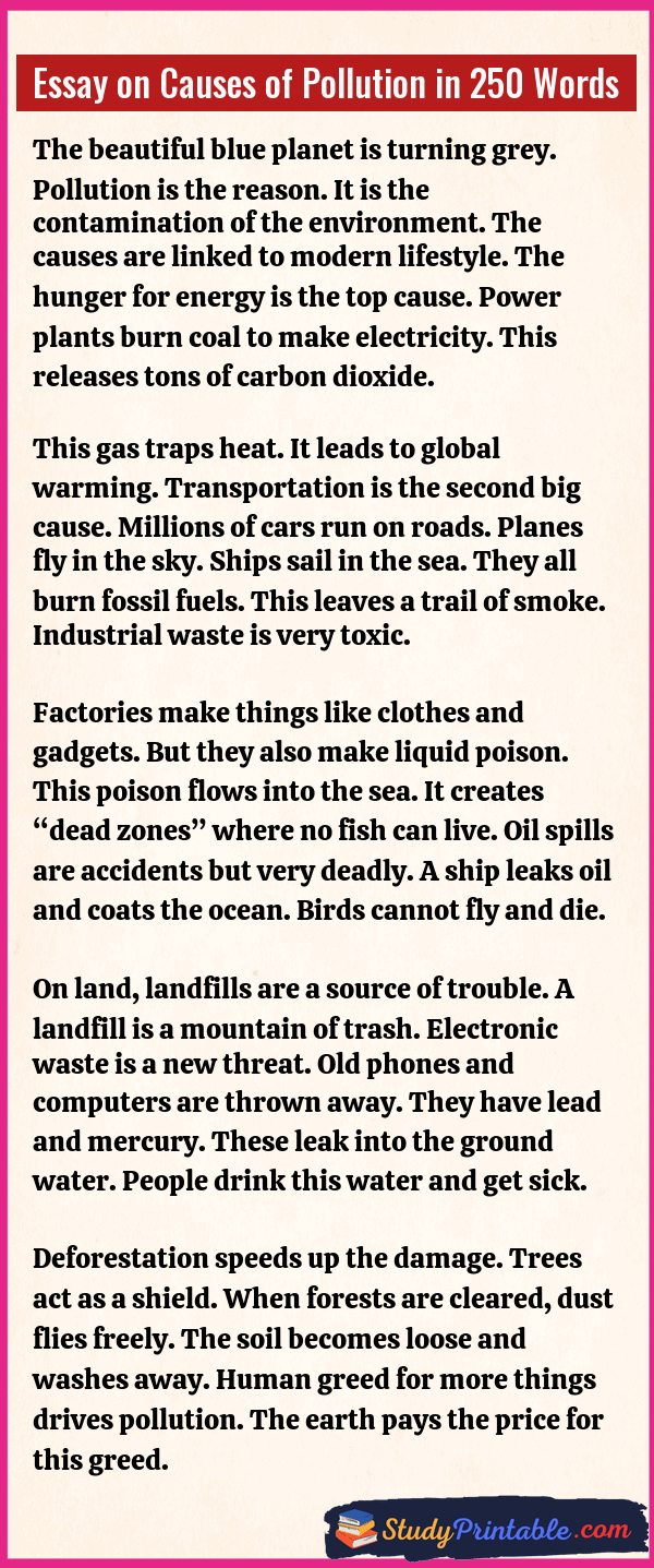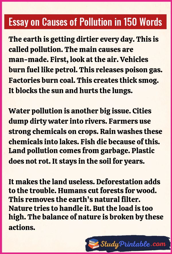 It ruins the land nearby. Even festivals cause pollution. Firecrackers produce noise and smoke. Loudspeakers disturb the peace. The causes are all around us. They are part of daily life. Changing these habits is the only way to stop the damage.