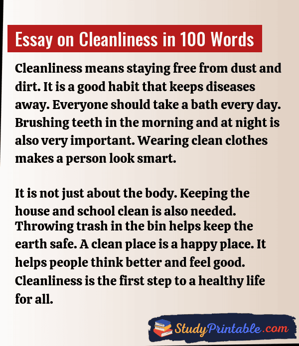 Cleanliness means staying free from dust and dirt. It is a good habit that keeps diseases away. Everyone should take a bath every day. Brushing teeth in the morning and at night is also very important. Wearing clean clothes makes a person look smart.