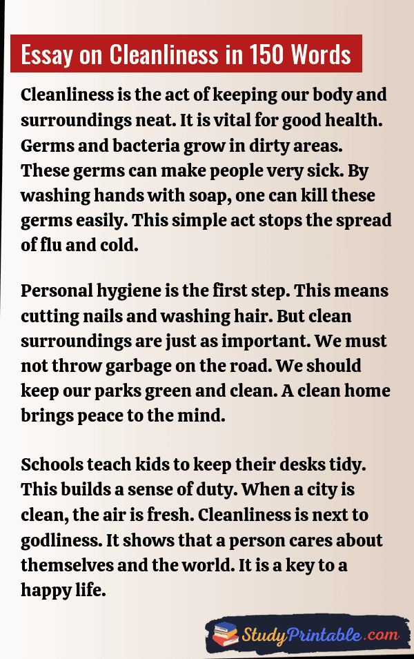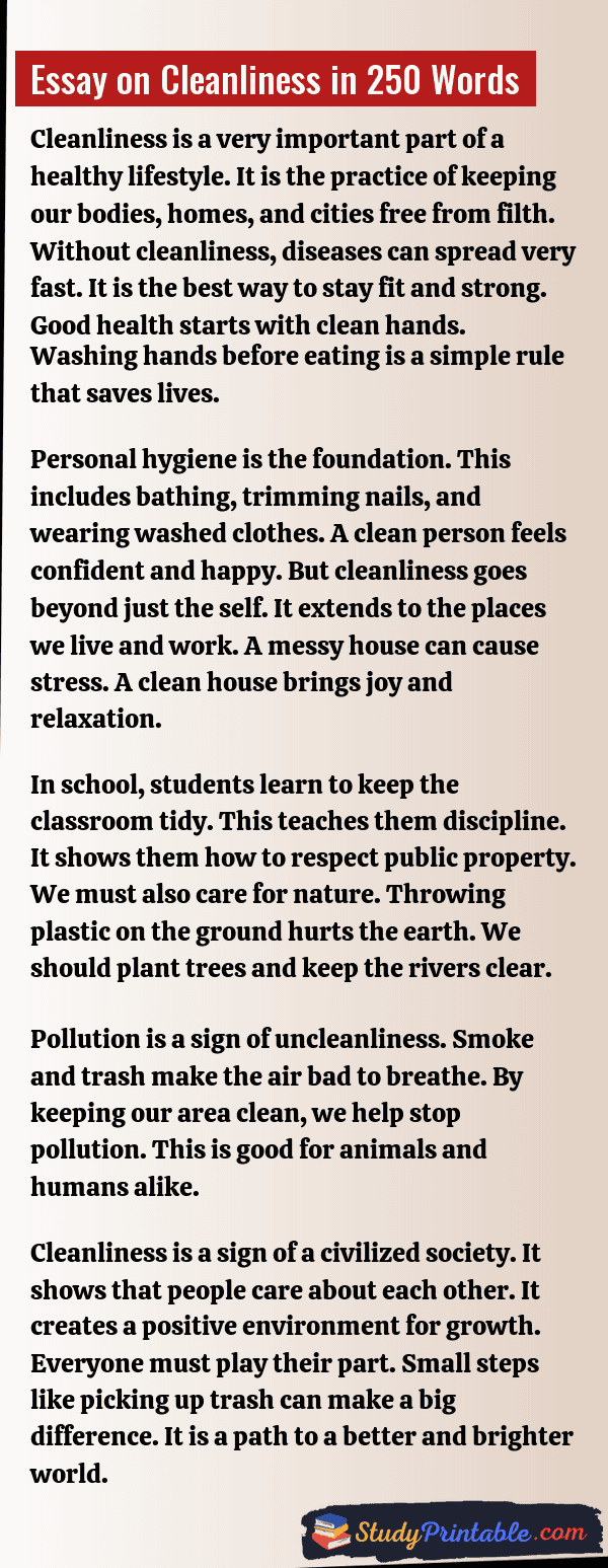 Cleanliness is the habit of keeping the body and the home free from dirt. It is very important for staying healthy and strong. Germs love to live in dirty places. When people stay clean, they do not get sick easily. It makes the mind feel fresh and happy. A clean person is liked by everyone in the town. Good habits start when we are young. Cleanliness helps us live a long and good life. The following essays are written for students from Class 1 to Class 12.