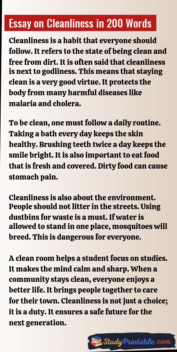 A clean room helps a student focus on studies. It makes the mind calm and sharp. When a community stays clean, everyone enjoys a better life. It brings people together to care for their town. Cleanliness is not just a choice; it is a duty. It ensures a safe future for the next generation.