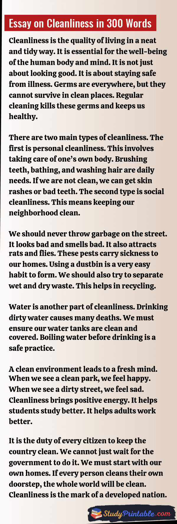 Cleanliness is the quality of living in a neat and tidy way. It is essential for the well-being of the human body and mind. It is not just about looking good. It is about staying safe from illness. Germs are everywhere, but they cannot survive in clean places. Regular cleaning kills these germs and keeps us healthy.