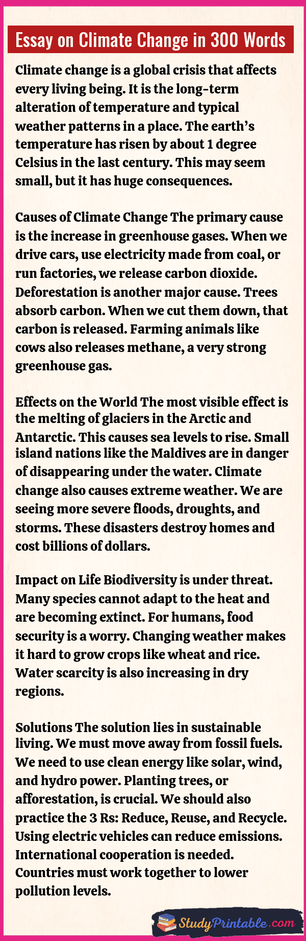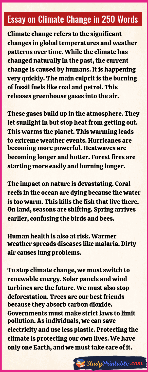 Climate change is a big change in the usual weather found in a place. This could be a change in how much rain a place usually gets in a year or a change in a place’s usual temperature. Earth’s climate is getting warmer, and this is causing problems for humans, animals, and plants. It causes ice to melt and oceans to rise. We need to act fast to stop it. The following essays are written for students from Class 1 to Class 12.