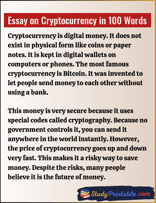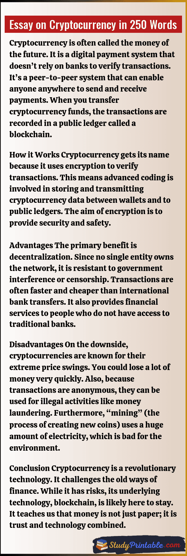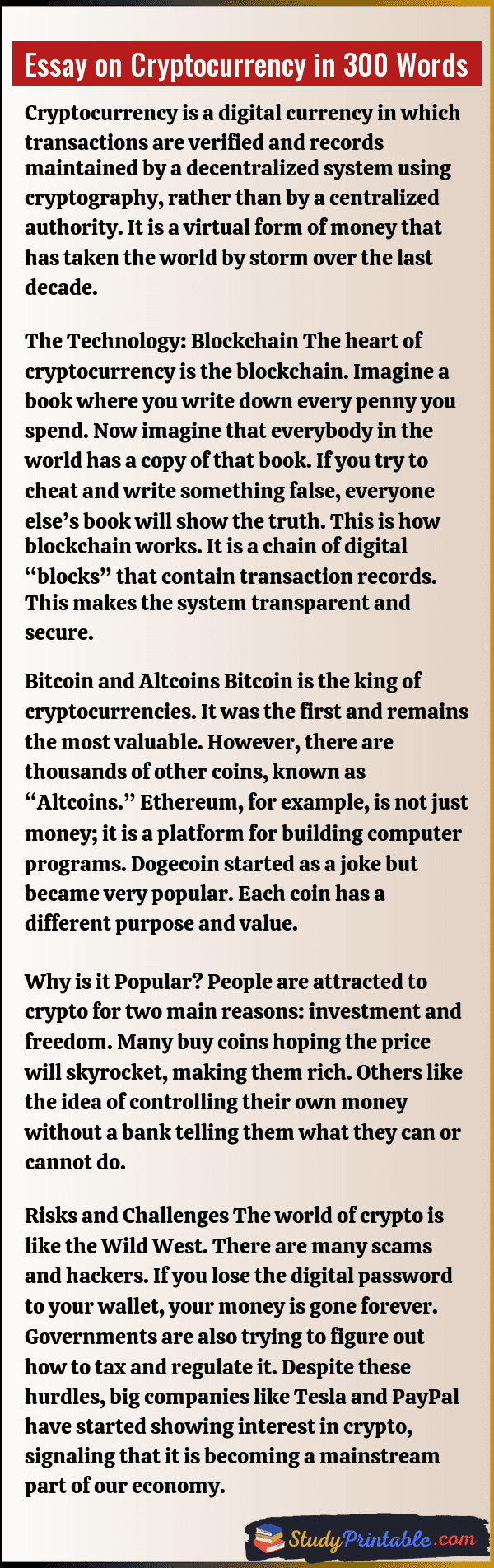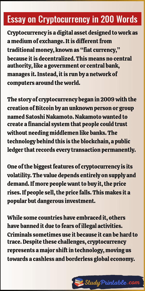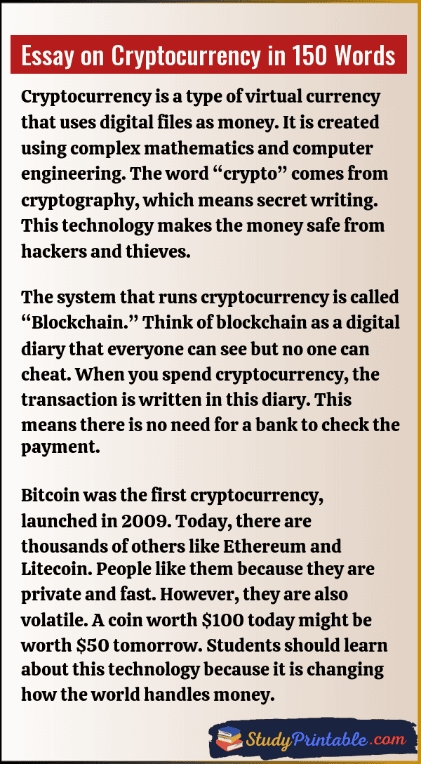 Cryptocurrency is a form of digital money that exists only on the internet. Unlike the cash we carry in our pockets, it is not printed by any government or bank. Instead, it relies on a technology called blockchain to keep it secure and honest. People use it to buy things, trade, or save for the future. While it offers freedom from traditional banks, it can also be risky because its value changes very quickly. The following essays explore this digital revolution for students from Class 1 to Class 12.