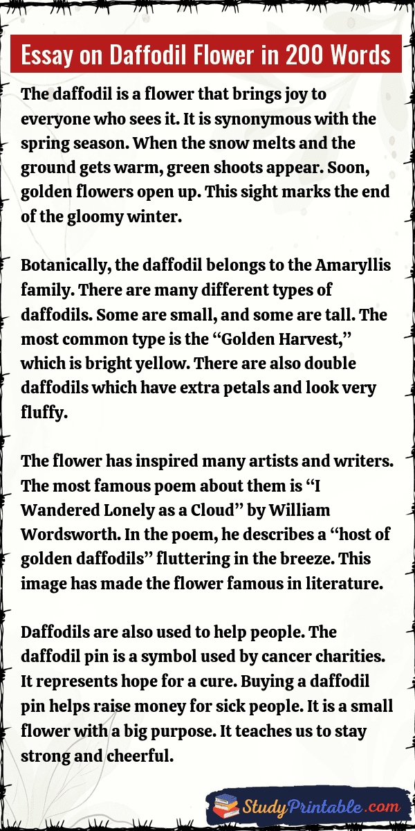 The daffodil is a bright and cheerful flower that signals the arrival of spring. With its yellow trumpet shape and long green leaves, it is a favorite in gardens around the world. It is known as a symbol of rebirth and new beginnings. Poets like William Wordsworth have written famous poems about its beauty. It is a flower that brings hope and happiness after a cold winter. The following essays are written for students from Class 1 to Class 12.