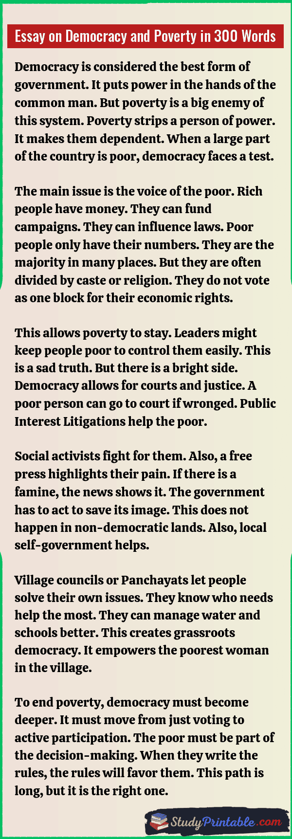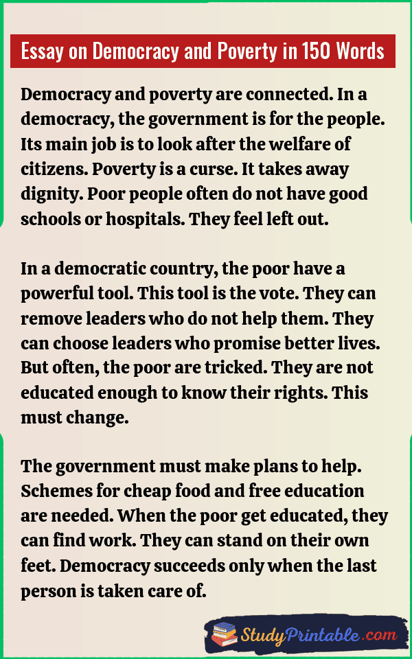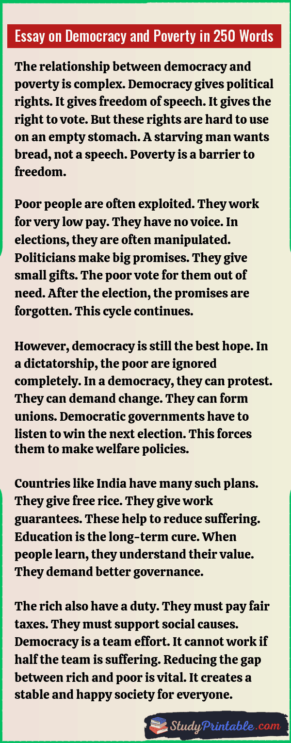 Democracy is a system where people choose their leaders. It promises freedom and equality for all. Poverty is a condition where people lack basic needs. It is a big challenge for any country. A true democracy must fight poverty. It must give every person a fair chance to live well. If people are hungry, voting has less meaning. These essays are written for students in classes 1 to 12.