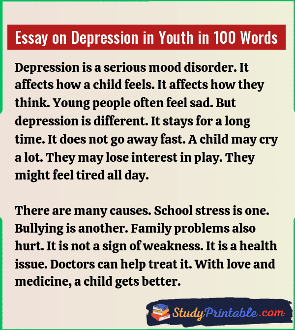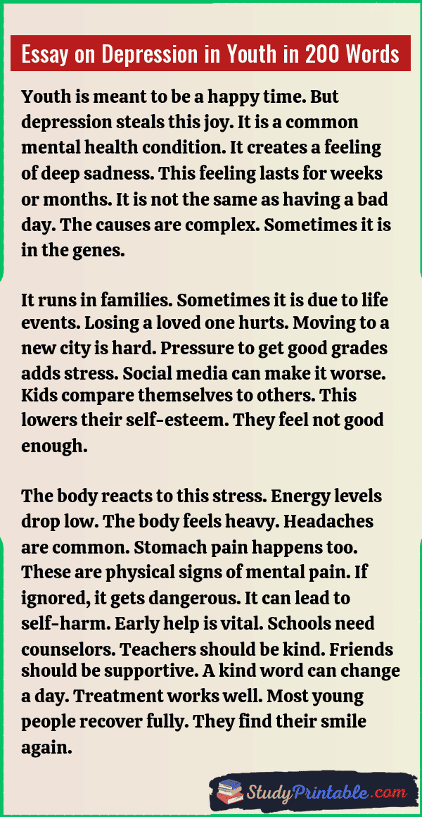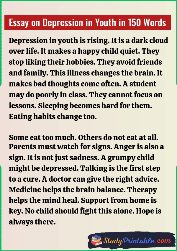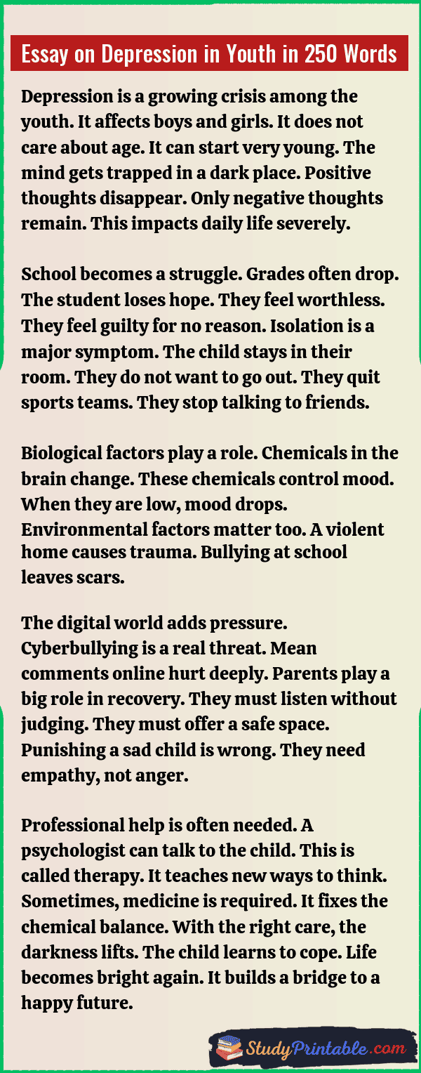 Depression is a big problem today. It is more than just feeling sad. It is a sickness of the mind. It stops young people from being happy. It can make school hard. It can hurt friendships. Many kids suffer in silence. They need love and care. Understanding this topic is vital. It saves lives. These essays are written for students in classes 1 to 12.