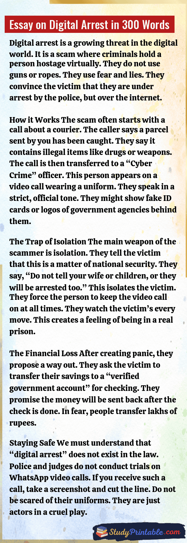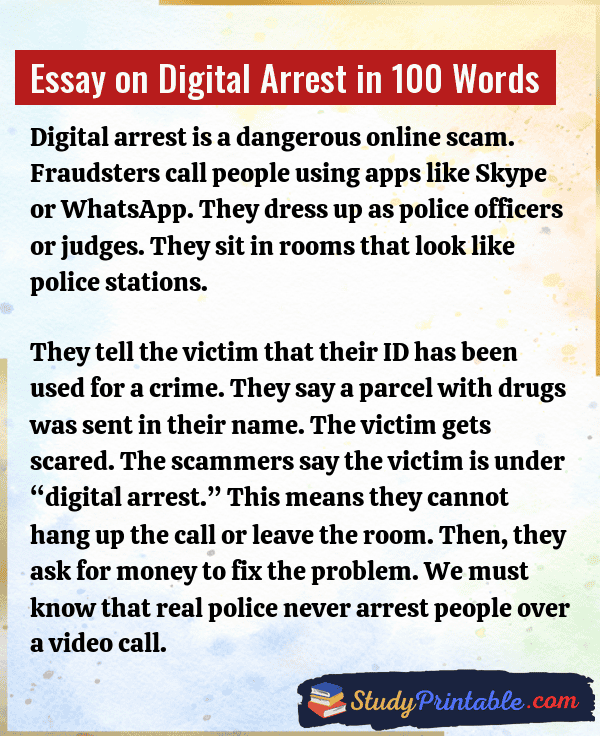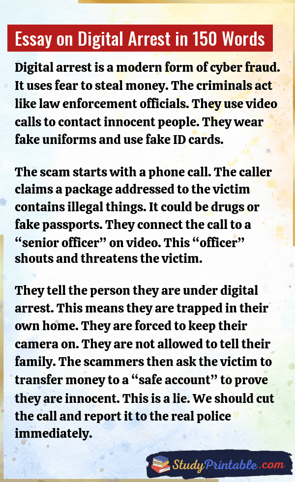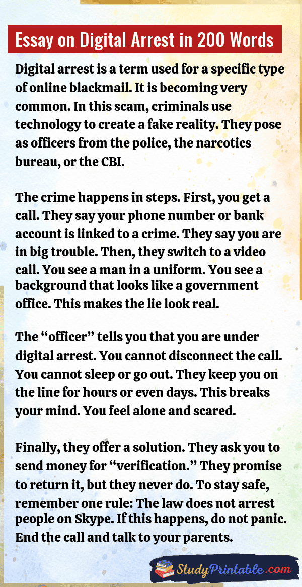 Digital arrest is a new kind of cyber crime. In this scam, bad people call you on a video app. They wear uniforms and pretend to be police officers. They tell lies that you have done a big crime. They force you to stay on the call and not talk to anyone. This is called “digital arrest.” They do this to steal money. It is scary, but we must be brave and smart to stop it. The following essays are written for students from Class 1 to Class 12.