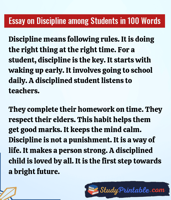 Discipline means following rules. It is doing the right thing at the right time. For a student, discipline is the key. It starts with waking up early. It involves going to school daily. A disciplined student listens to teachers.