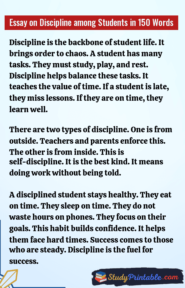 Discipline is the backbone of student life. It brings order to chaos. A student has many tasks. They must study, play, and rest. Discipline helps balance these tasks. It teaches the value of time. If a student is late, they miss lessons. If they are on time, they learn well.
