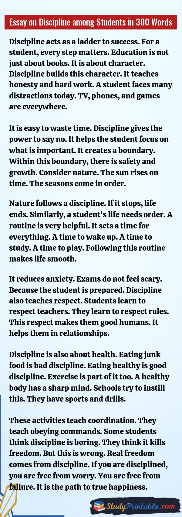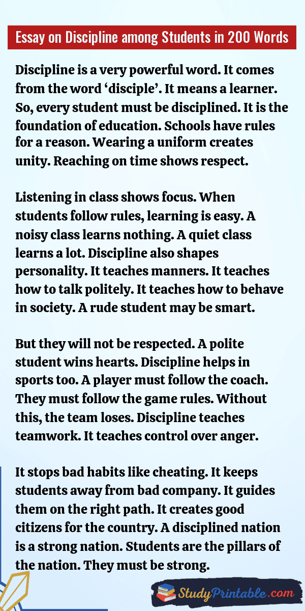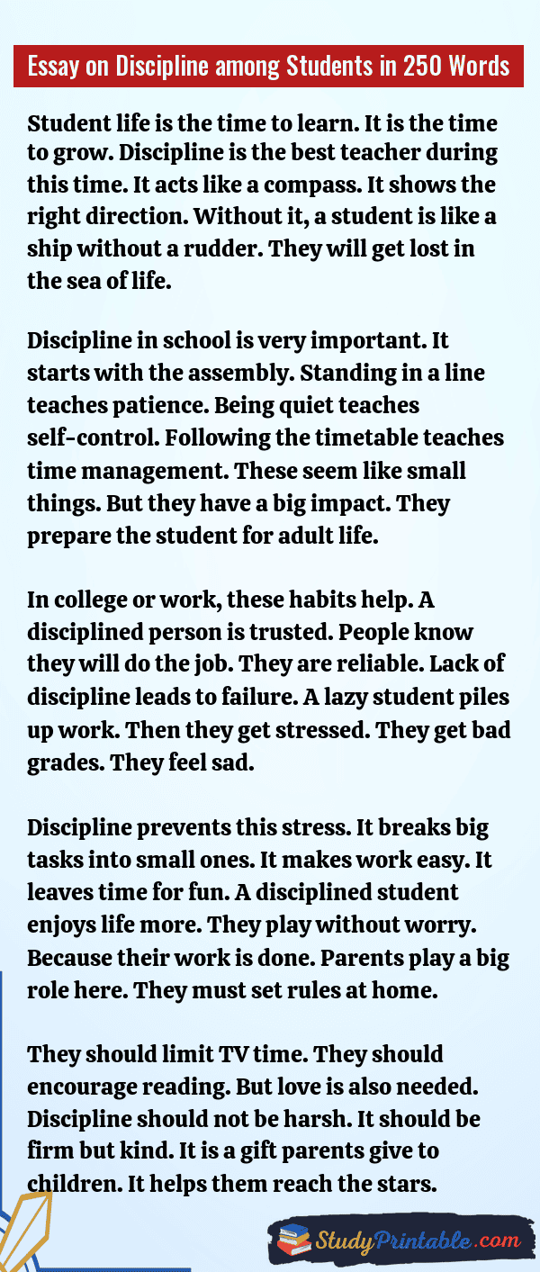 It teaches self-control. Students feel anger and jealousy. Discipline helps control these emotions. It stops them from fighting. It makes them calm and polite. A polite person is loved by all. Manners make a man. Discipline makes those manners.