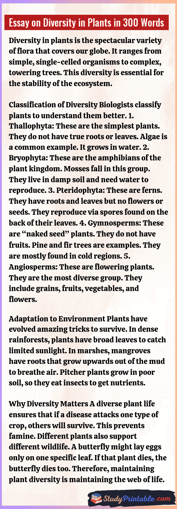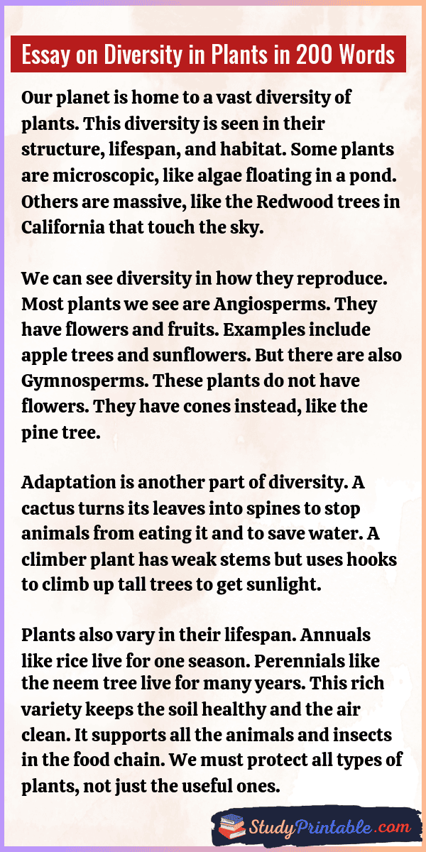 The world is full of different kinds of plants. From tiny green moss on a rock to giant banyan trees, the variety is endless. This is called diversity in plants. Some plants grow in water, while others grow in dry deserts. Some give us sweet fruits, while others have sharp thorns. This mix of shapes, sizes, and colors makes nature beautiful and keeps life on Earth going. The following essays are written for students from Class 1 to Class 12.
