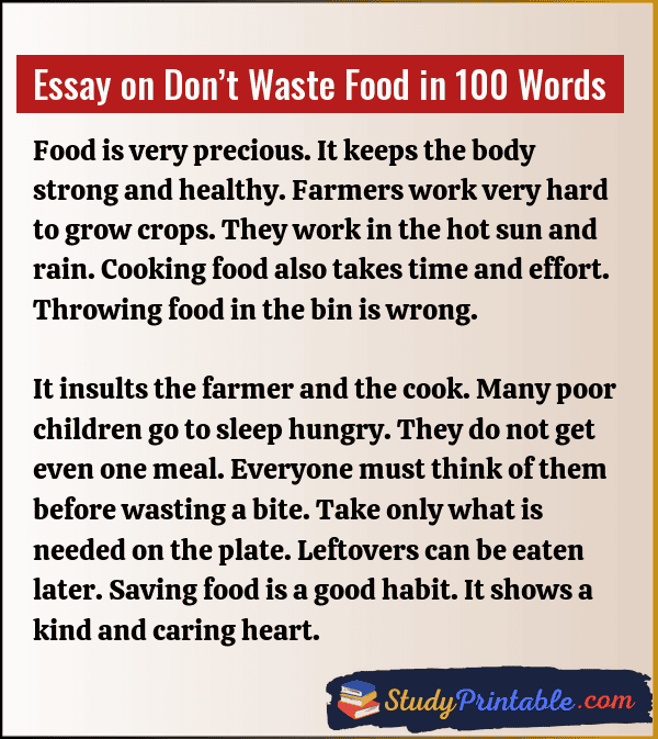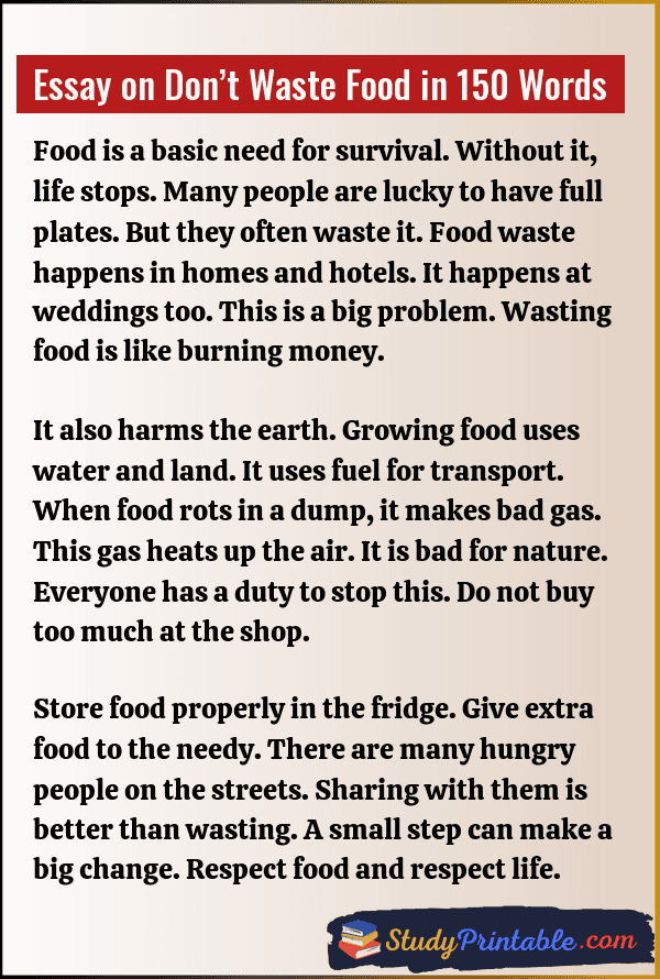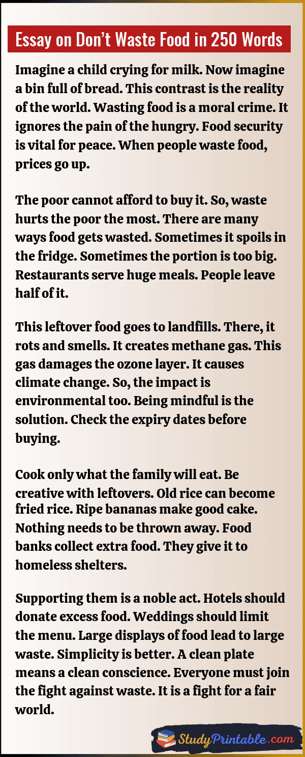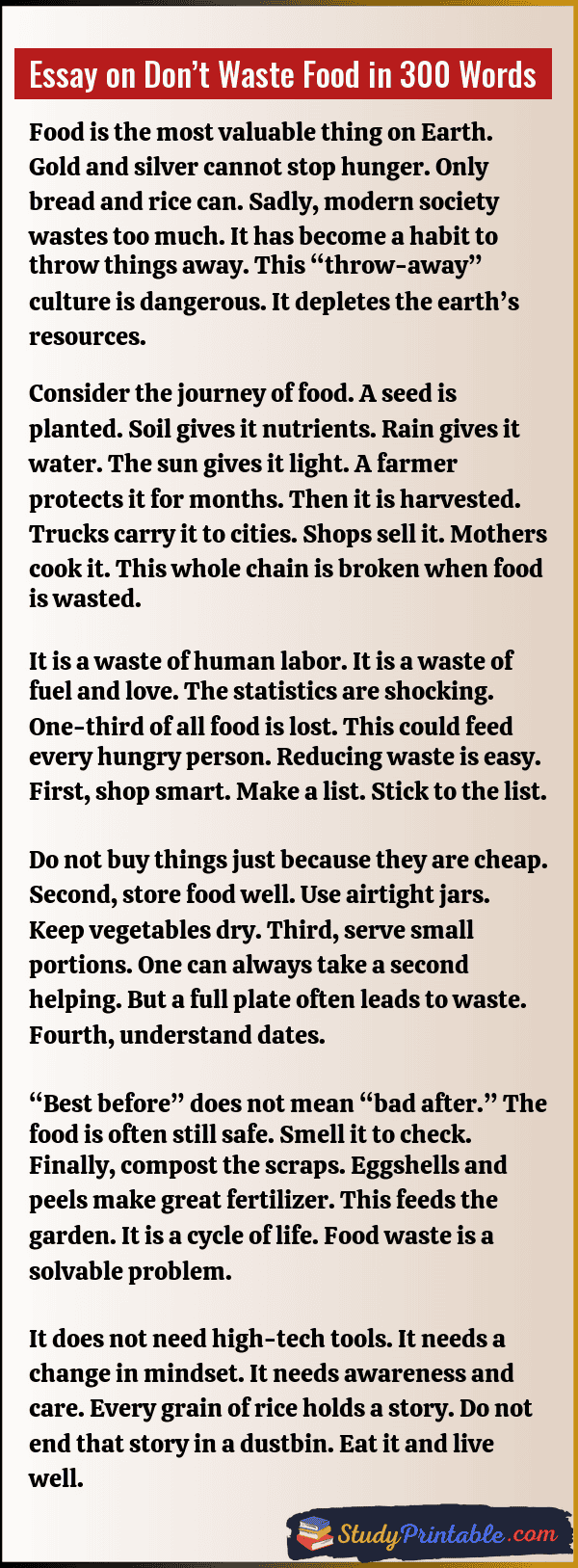 Food is the fuel for life. It gives energy to play and work. Millions of people do not have enough to eat. Yet, tons of food are thrown away daily. This is a sad truth. Wasting food wastes money and nature’s gifts. Saving food helps the hungry. It protects the planet. These essays are written for classes 1 to 12.