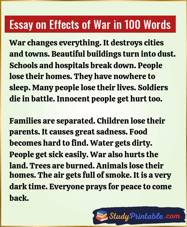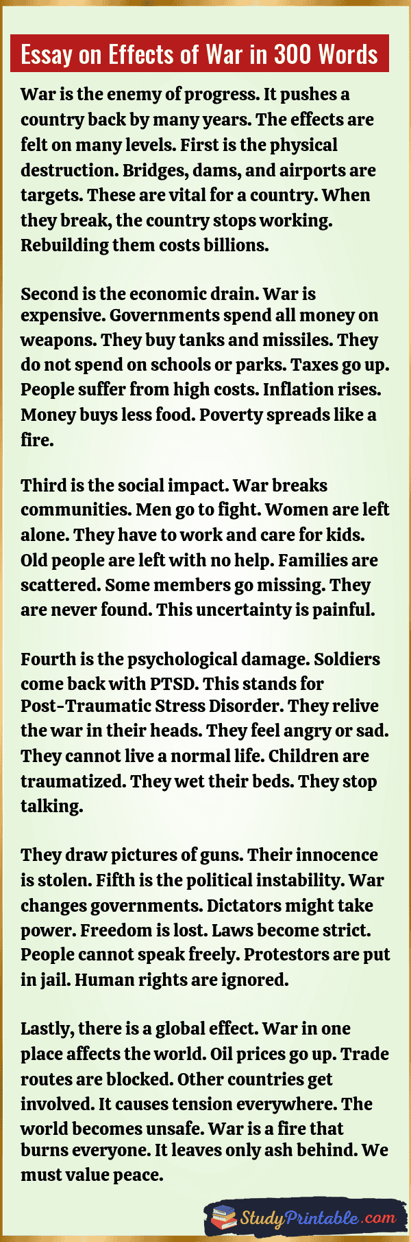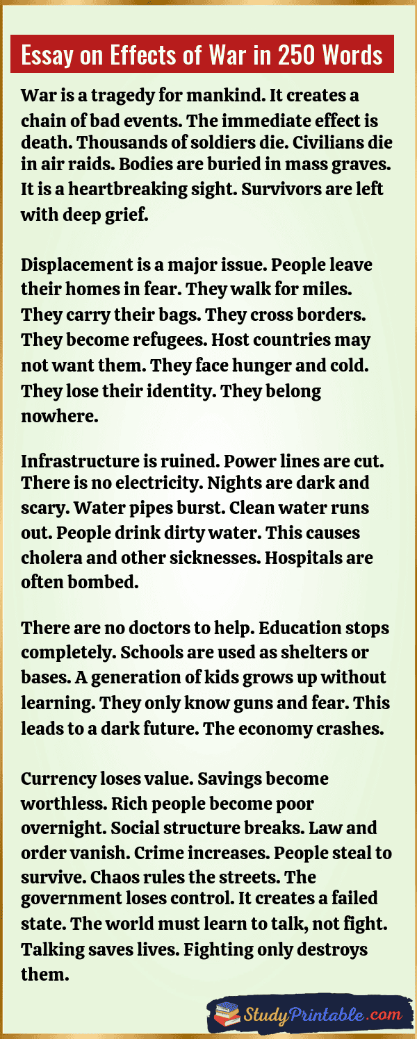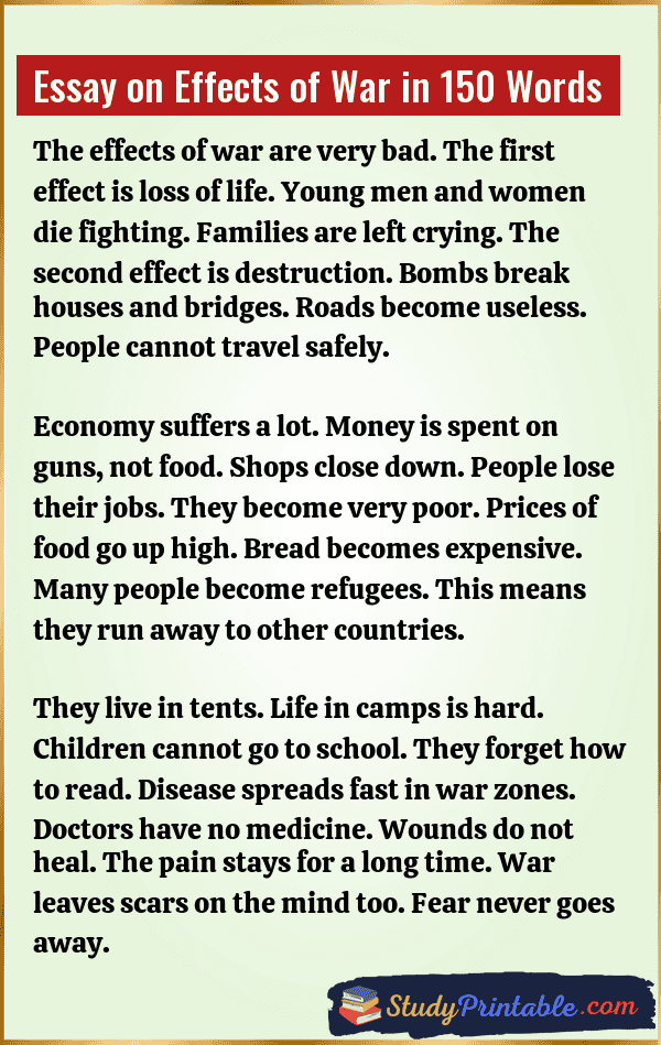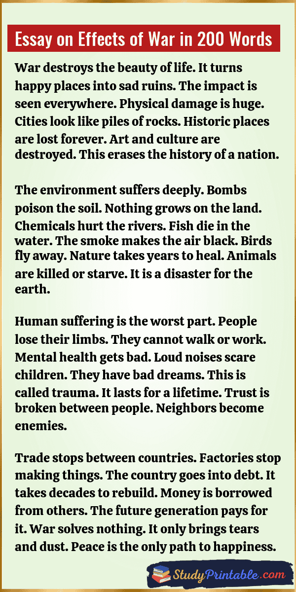 War is a terrible event. It brings great pain to the world. Cities fall down. Homes are lost. Many people get hurt. Families are broken apart. Trees and animals suffer too. The sadness lasts for many years. It takes a long time to fix the damage. Peace is very important for life. These essays are written for students in classes 1 to 12.