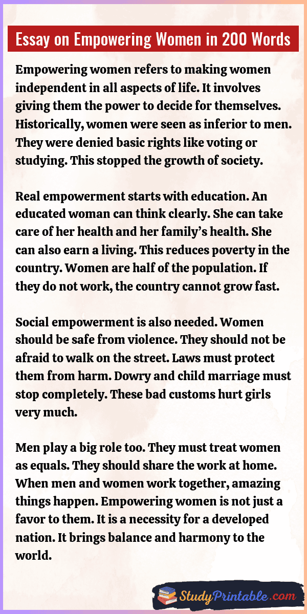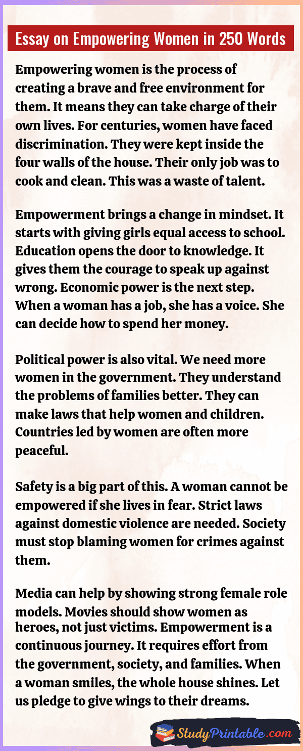 Empowering women means giving them the power to choose their own path in life. It is about making sure women have the same rights as men. When women are strong, families become strong. This leads to a happy and rich country. It helps end poverty and unfair treatment. Education is the best tool to give them this power. A world with equal women is a better world for everyone. The following essays are written for students from Class 1 to Class 12.