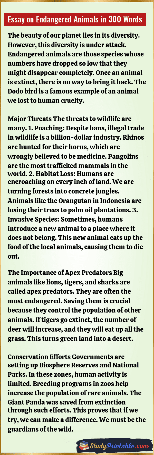 Endangered animals are those that are in danger of disappearing from the Earth forever. Imagine a world without tigers, elephants, or pandas. It is a scary thought, but it could become true if we are not careful. These animals are dying because they are losing their homes and being hunted by humans. Protecting them is not just about saving animals; it is about keeping the balance of nature safe. Every creature has a role to play in the circle of life. The following essays are written for students from Class 1 to Class 12.