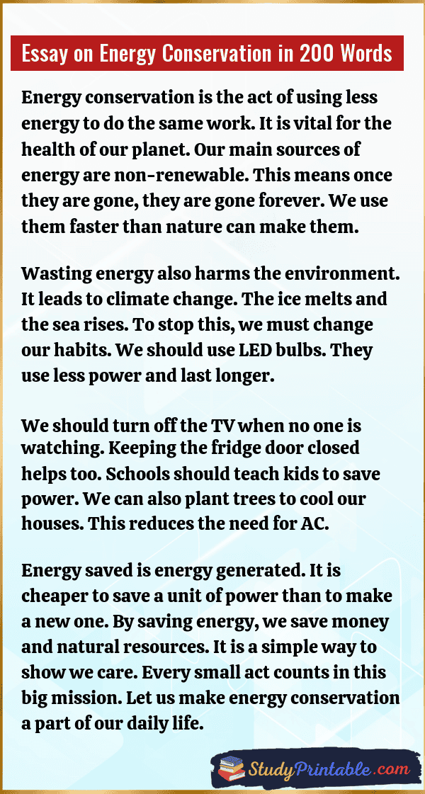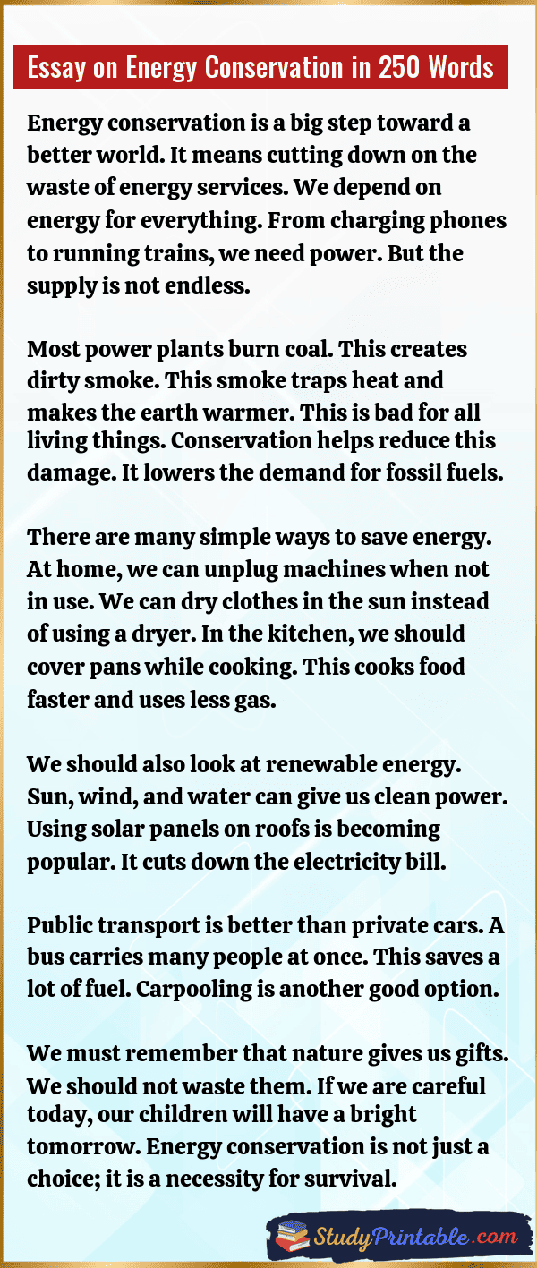 Energy conservation is the practice of using less power to save the earth. It is very important because our fuel is running out. Burning coal and oil hurts the air and makes the planet hot. If we save energy today, we will have light for tomorrow. It saves money for the family and the country. Small steps like turning off a switch can make a huge change. It keeps the environment clean and safe for animals and trees. The following essays are written for students from Class 1 to Class 12.
