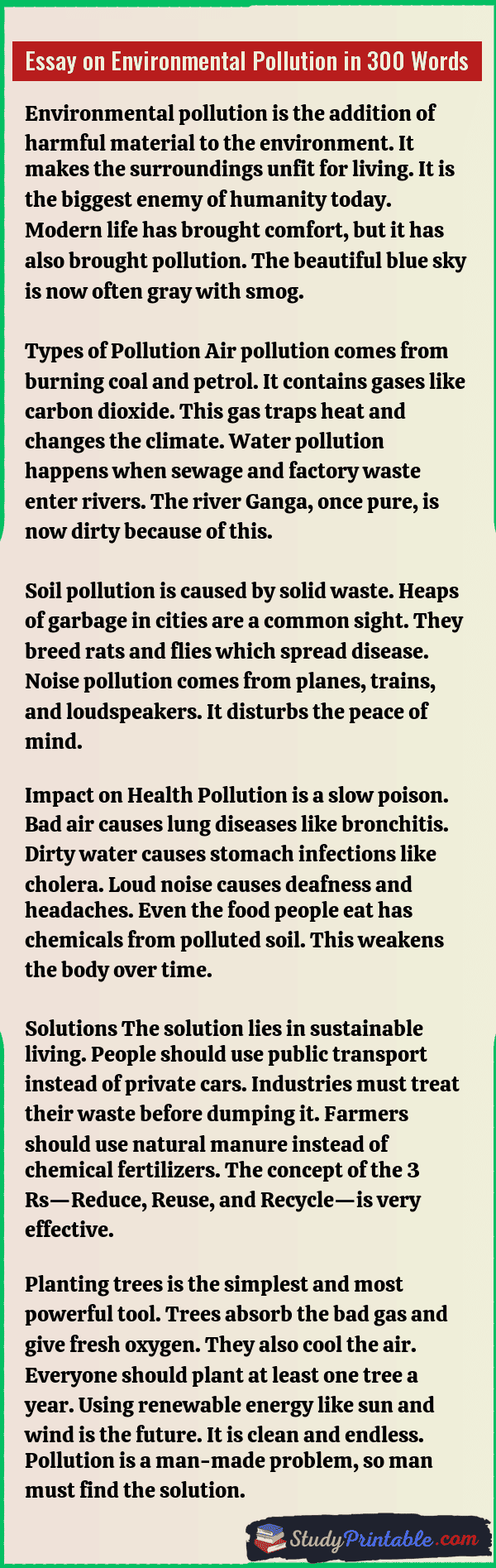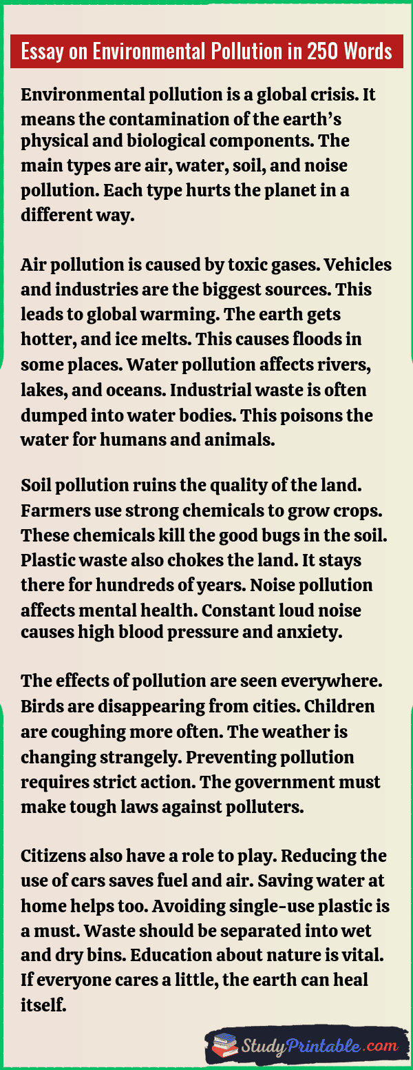 Environmental pollution is the mixing of harmful things into nature. It makes the air, water, and land dirty and unsafe. This is a very big problem for the whole planet. It hurts humans, animals, and plants every single day. Dirty air makes it hard to breathe, and dirty water spreads sickness. Saving the earth is the duty of every person. If the world stays clean, life will be happy and healthy. The following essays are written for students from Class 1 to Class 12.