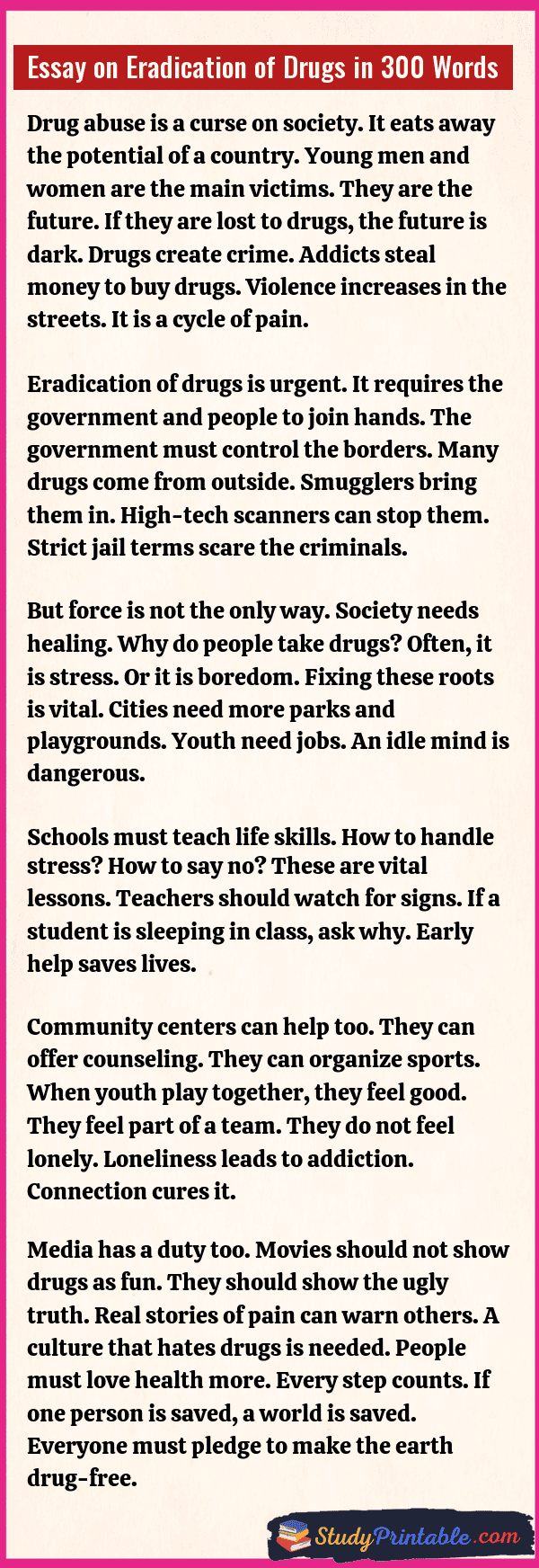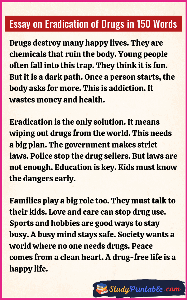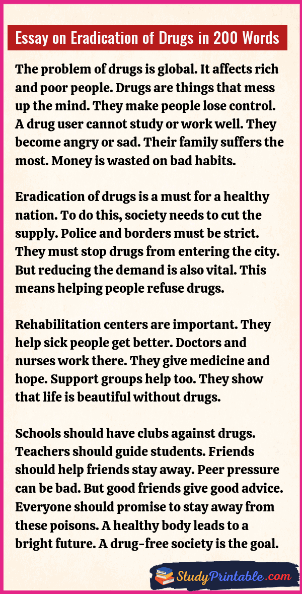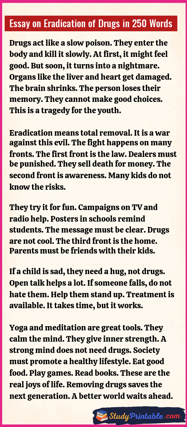 Drugs are harmful substances that hurt people and families. They damage the body and the mind. Getting rid of them completely is very important. This will make the world safe and happy. Everyone must work together to stop this problem. A healthy life is the best life. These essays are written for students in classes 1 to 12.