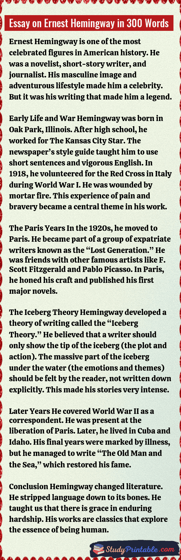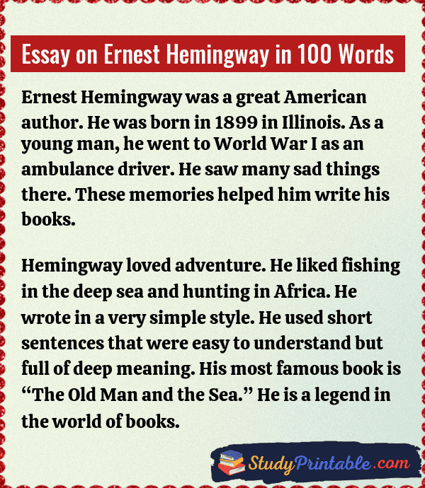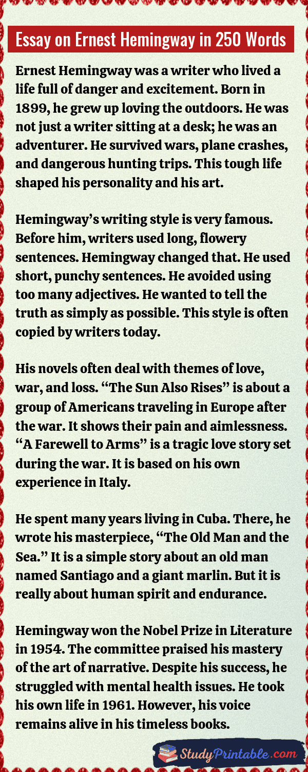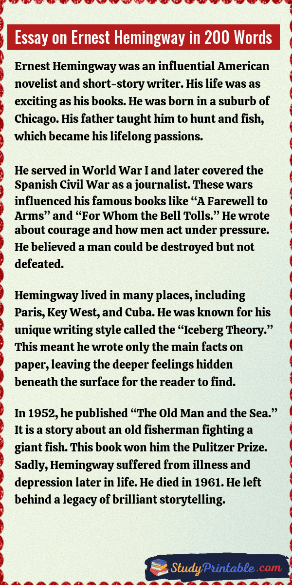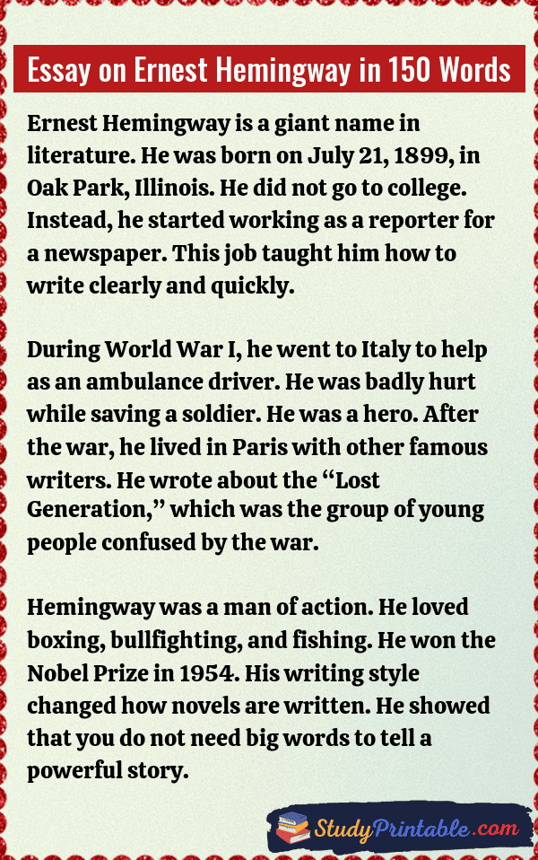 Ernest Hemingway was one of the most famous American writers of the 20th century. He was known for his adventurous life and his simple, strong way of writing. He wrote about war, hunting, and fishing. His stories often featured brave men facing hard challenges. He won the Nobel Prize for Literature, which is a very big honor. His books, like “The Old Man and the Sea,” are still read by millions of people today. The following essays are written for students from Class 1 to Class 12.