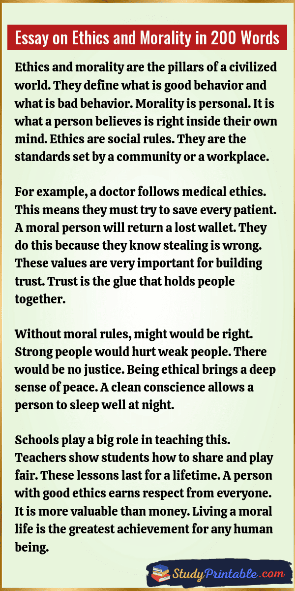 Ethics and morality are the invisible rules that guide human behavior. They help people tell the difference between right and wrong. Acting with goodness brings peace to the heart and the world. These values build strong trust among friends and strangers. A life without them is full of chaos. Learning these values is vital for a happy future. These essays are written for students from Class 1 to Class 12.