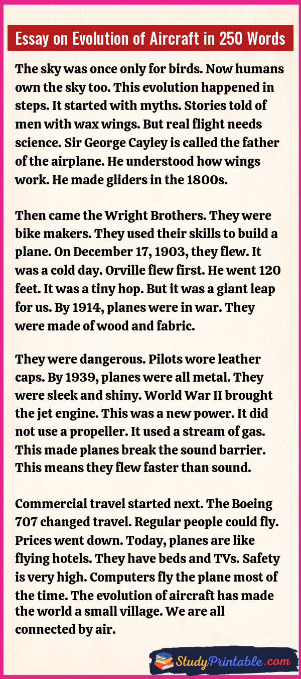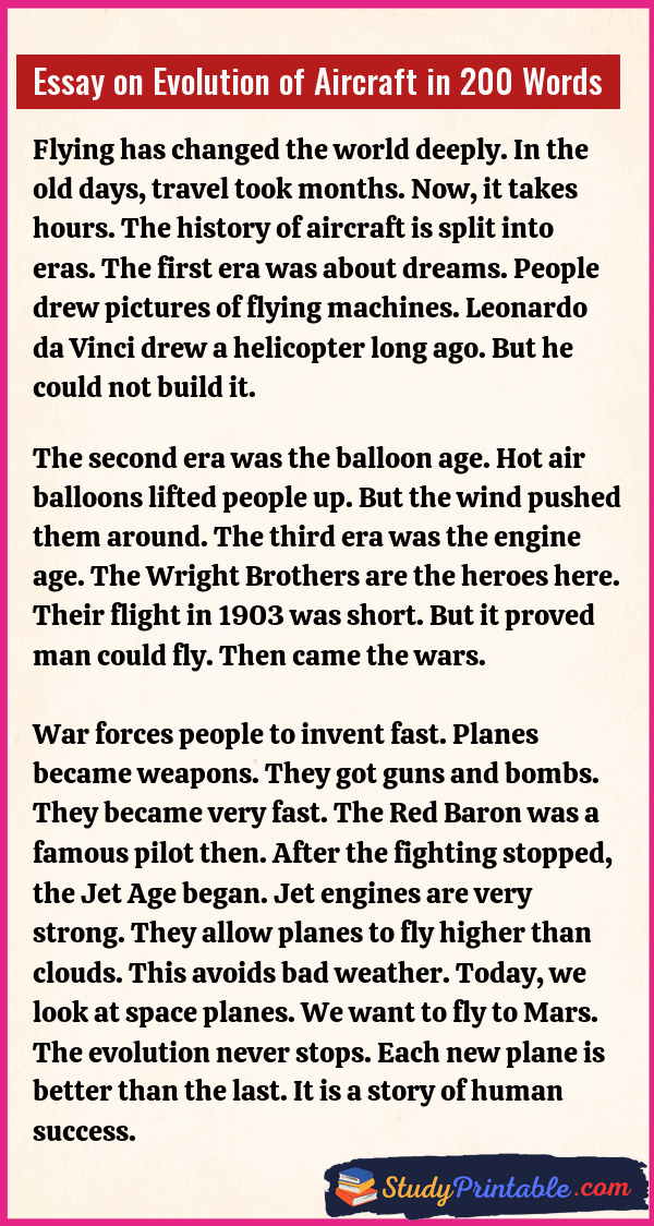 Long ago, people looked at birds. They wanted to fly like them. It was a big dream. Today, giant metal birds fly in the sky. They carry people across oceans. They carry heavy goods too. This change did not happen in one day. It took many years and brave minds. The story of flying is full of magic and science. It shows how humans conquered the air. These essays are written for students in classes 1 to 12.