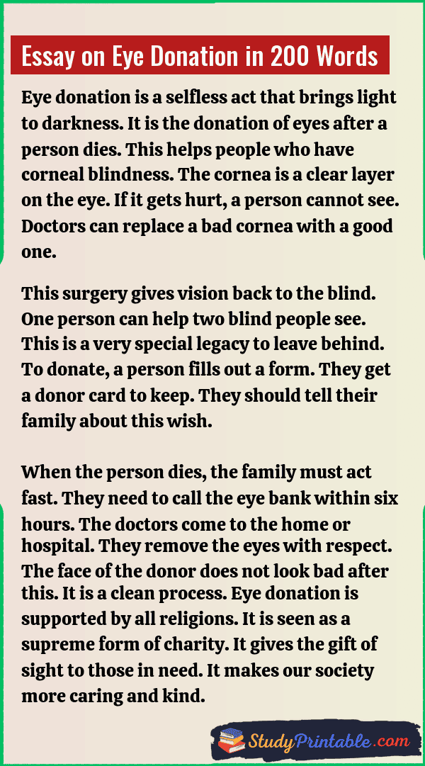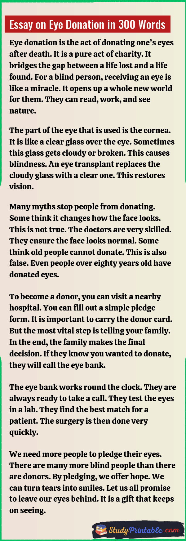 Eye donation is a very noble act of charity. It is when a person chooses to give their eyes after they pass away. This gift can help a blind person see the world for the first time. It is like giving a second life to someone who lives in the dark. The eyes are taken only after death. One person can light up the lives of two blind people. It is a simple process but it has a huge impact. By donating eyes, a person lives on even after they are gone. It brings joy to families and hope to society. The following essays are written for students from Class 1 to Class 12.