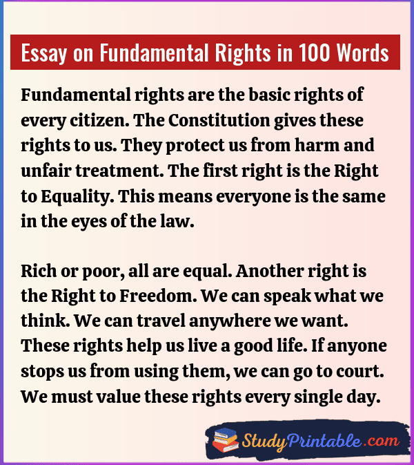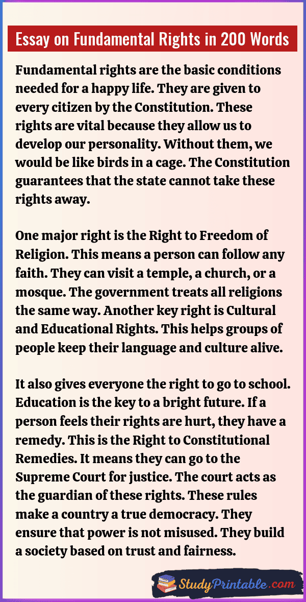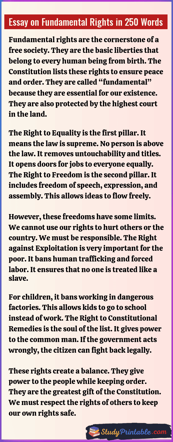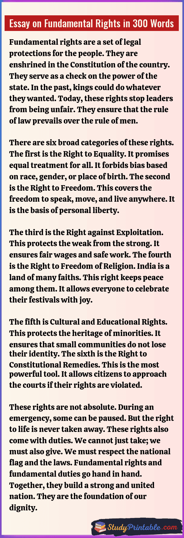 Fundamental rights are very special rules that protect every person. They are written in the Constitution, which is the big book of laws. These rights make sure that everyone is free and safe. They allow people to speak, pray, and live without fear. They treat everyone as equals, no matter who they are. Without these rights, life would be unfair and hard. They are the heart of a free country. The following essays are written for students from Class 1 to Class 12.