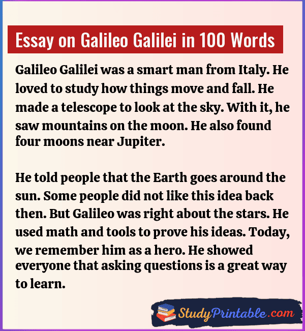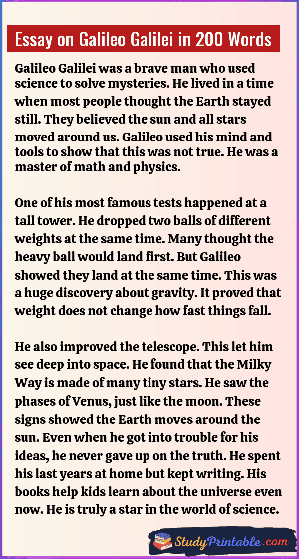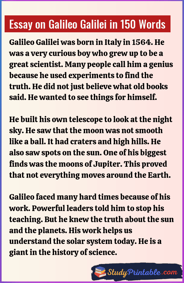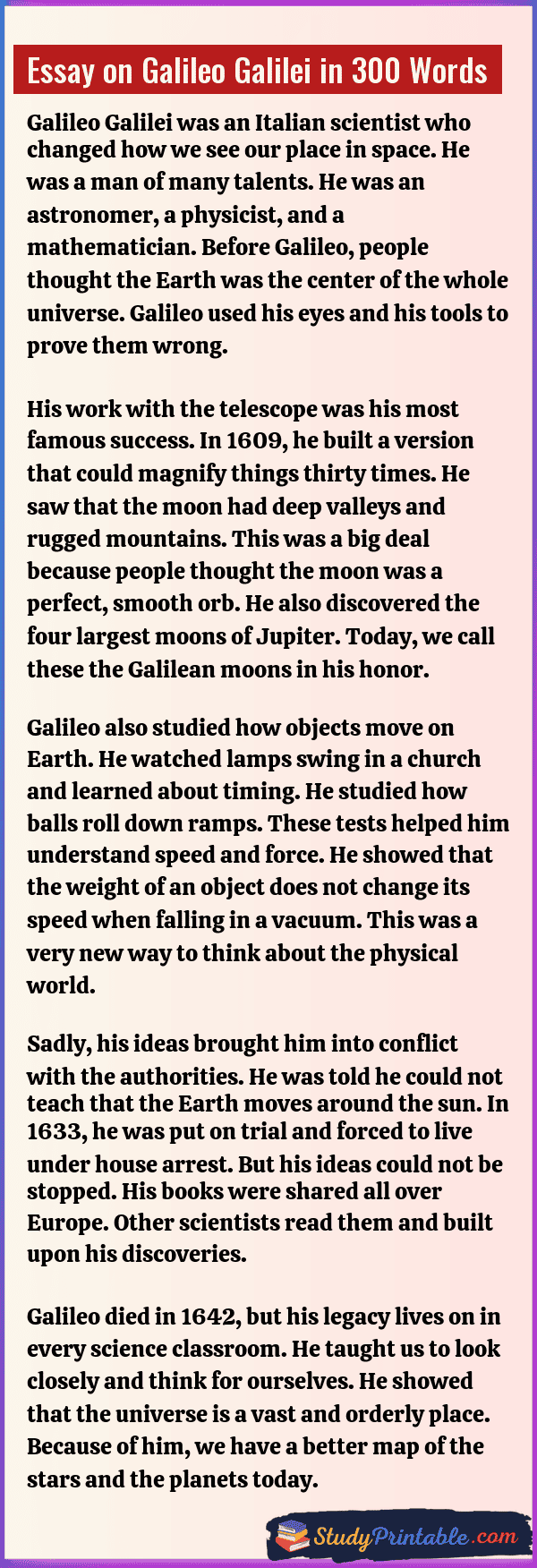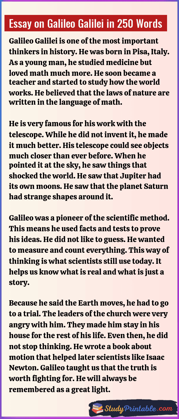 Galileo Galilei was a very famous scientist who lived a long time ago. He changed the way people look at the stars and the world. His work helped us learn that the Earth moves around the sun. This was a very big idea that changed science forever. He is often called the father of modern science. Because of his hard work, we know much more about space today. He used a telescope to see things no one had ever seen before. The following essays are written for students from Class 1 to Class 12.