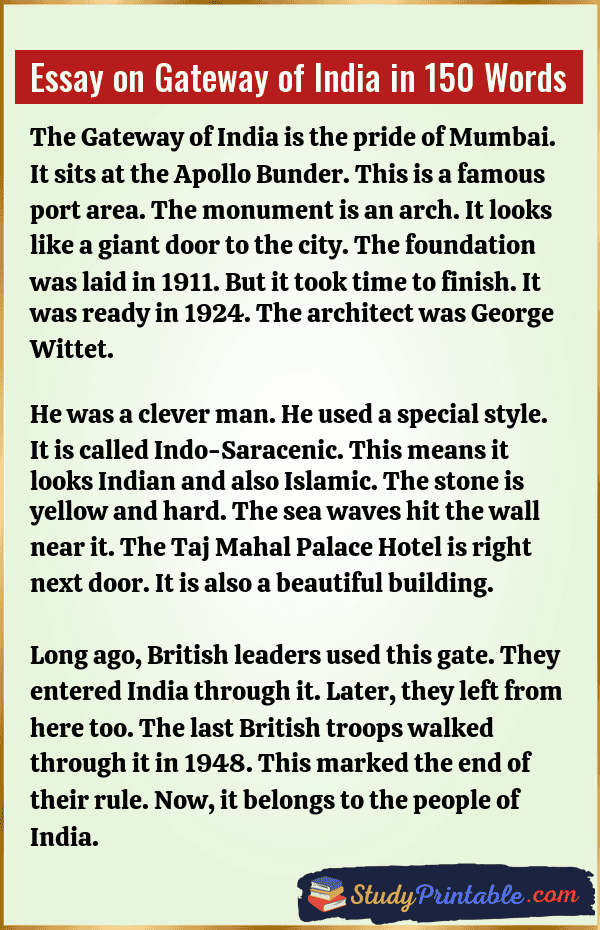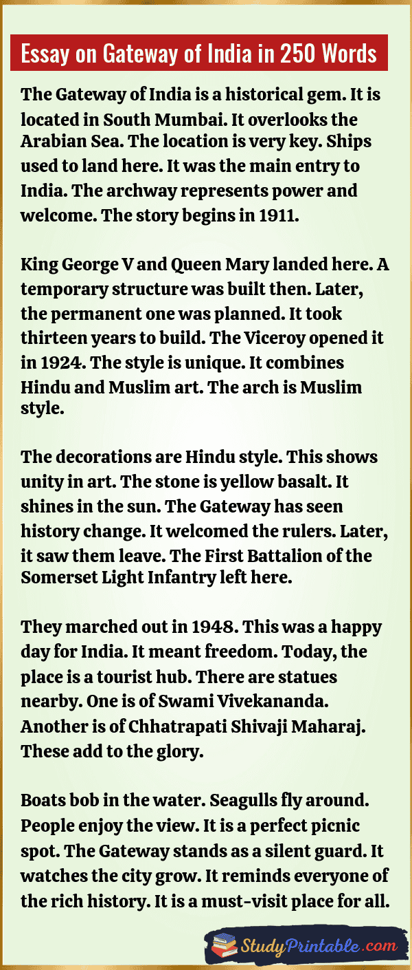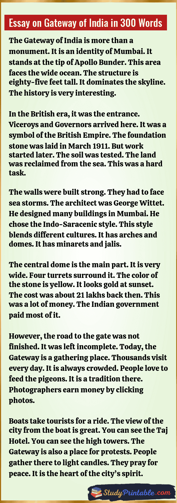 The Gateway of India is a grand structure. It stands in the city of Mumbai. It is a mark of history. It faces the vast Arabian Sea. It was built for a King and Queen. Today, it is a major spot for tourists. People come from all over the world. They stand under the high arch. They look at the boats. It is a symbol of the city’s pride. These essays are written for students in classes 1 to 12.
