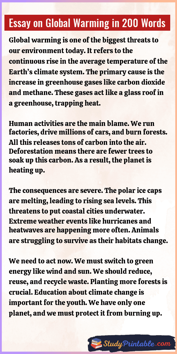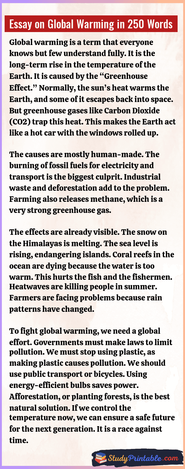 Global warming is the slow rise in the Earth’s temperature. It is a big problem that affects everyone. Our planet is getting hotter because of too much smoke and pollution. This heat is melting the ice in the north and south poles. It is changing the weather and causing big storms. If we do not stop it, life will become very hard for humans and animals. We must learn about it to save our home. The following essays are written for students from Class 1 to Class 12.