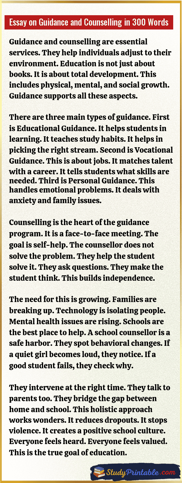 This support is vital. It keeps the mind healthy. A happy mind learns better. Without help, small problems become big. Guidance stops this. It points to the right direction. It helps students become responsible adults. It is a pillar of a good education system.