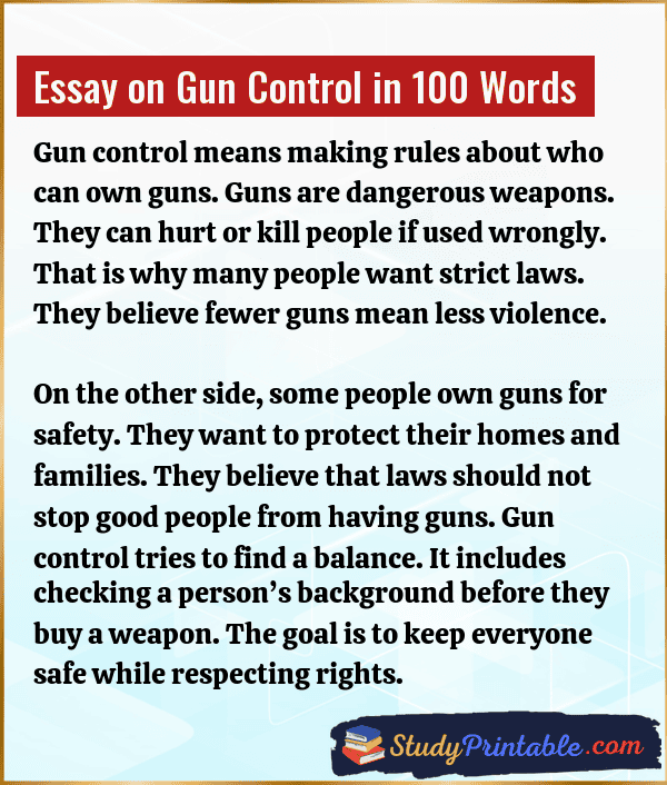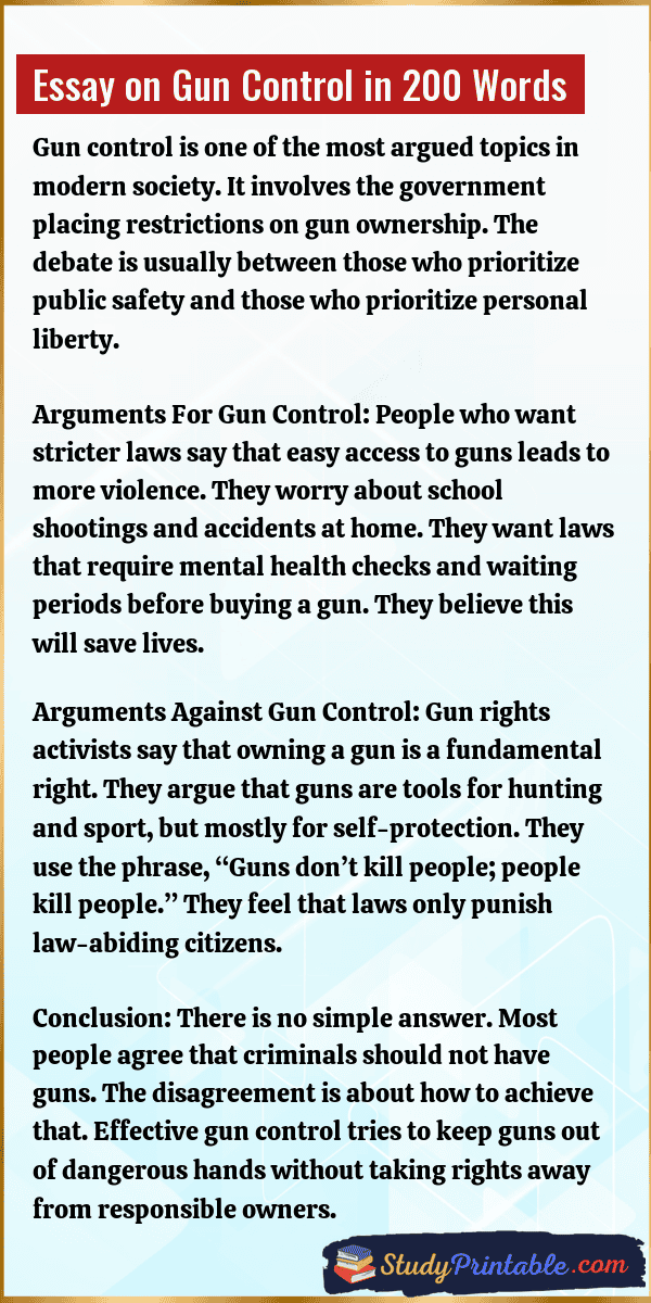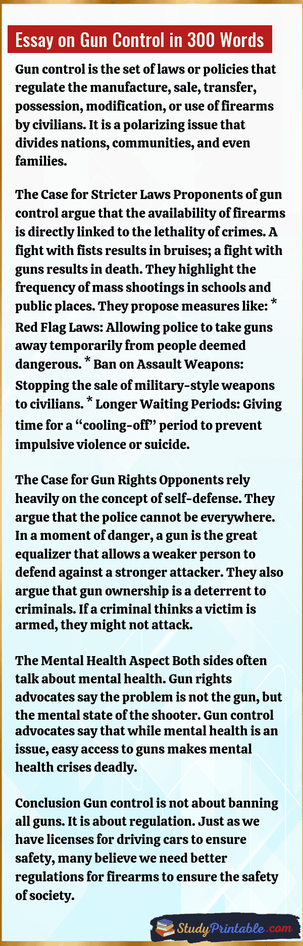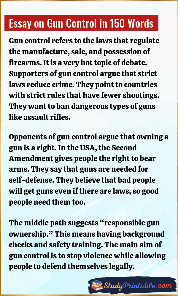Gun control is a set of laws that control how people can buy and own firearms. It is a very important topic in many countries, especially in the United States. People have different opinions on it. Some say strict laws make society safer, while others say owning a gun is a basic right for protection. Balancing safety and freedom is the main challenge. The following essays explore this complex issue for students from Class 1 to Class 12.